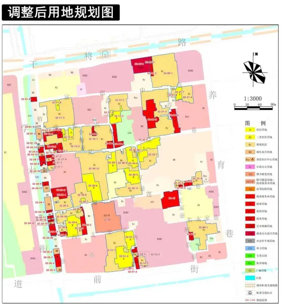 (3)将32-12、32-17、32-39地块的部分用地性质调整为商业服务业用地(B)、居住用地(R);