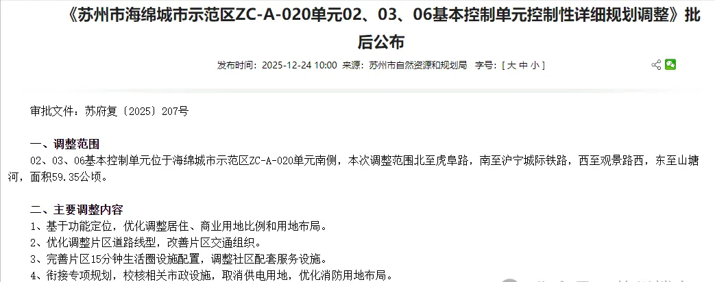 近日,《苏州市海绵城市示范区ZC - A - 020单元02、03、06基本控制单元控制性详细规划调整》完成审批流程后正式公布。