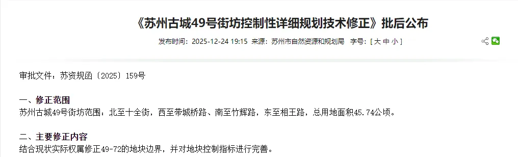 《苏州古城49号街坊控制性详细规划技术修正》已完成审批流程,现正式向社会公布。