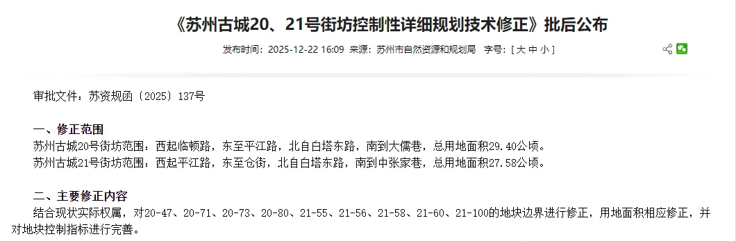 《苏州古城20、21号街坊控制性详细规划技术修正》已顺利完成审批流程,现正式对外公布。