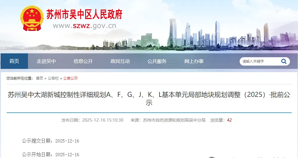 苏州吴中太湖新城控制性详细规划A、F、G、J、K、L基本单元局部地块规划调整(2025)·批前公示