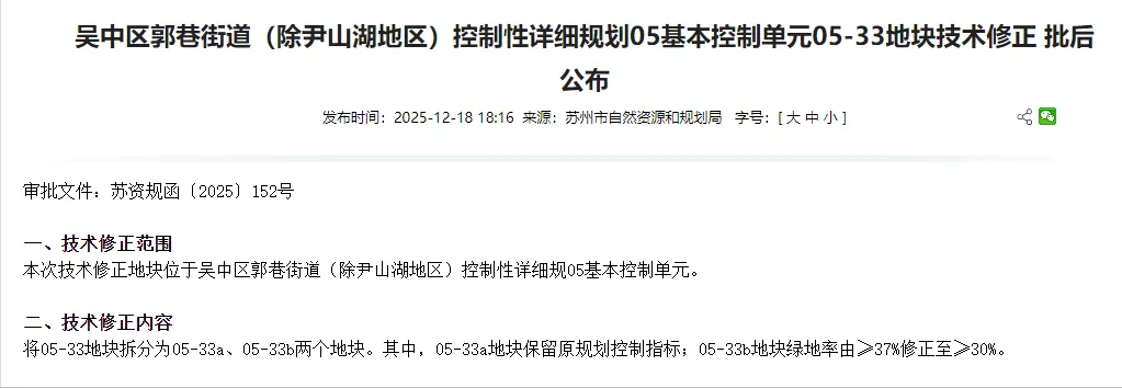 《吴中区郭巷街道(除尹山湖地区)控制性详细规划05基本控制单元05 - 33地块技术修正》已完成审批,现正式对外公布。