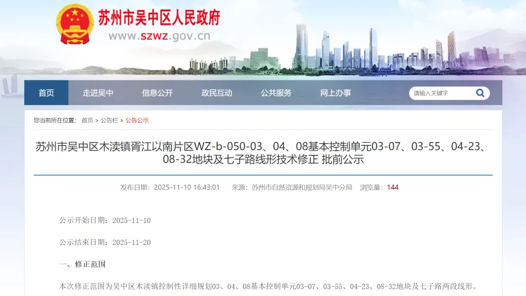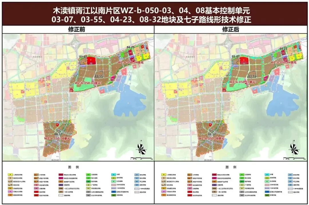 本次修正范围为吴中区木渎镇控制性详细规划03、04、08基本控制单元03-07、03-55、04-23、08-32地块及七子路两段线形。