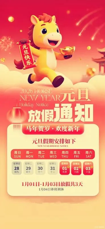 放假安排:1月1日(周四)至3日(周六)放假调休,共3天。1月4日(周日)上班。