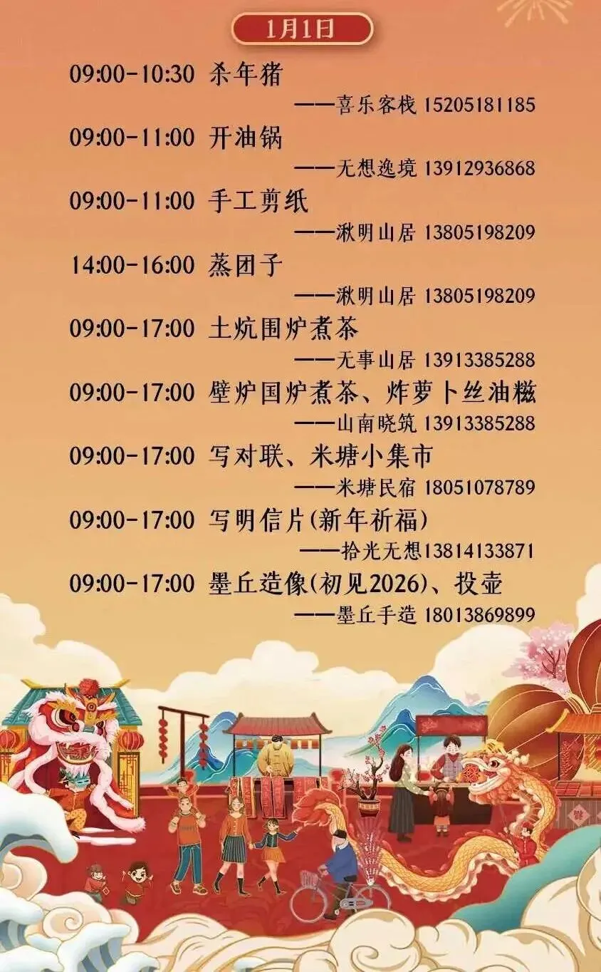 温馨贴士:篝火、造雪、手狮舞、音乐会等为免费公开活动;火锅烧烤位、非遗花饽饽制作等为限量收费项目,建议提前扫码咨询客服预约,锁定精彩体验。