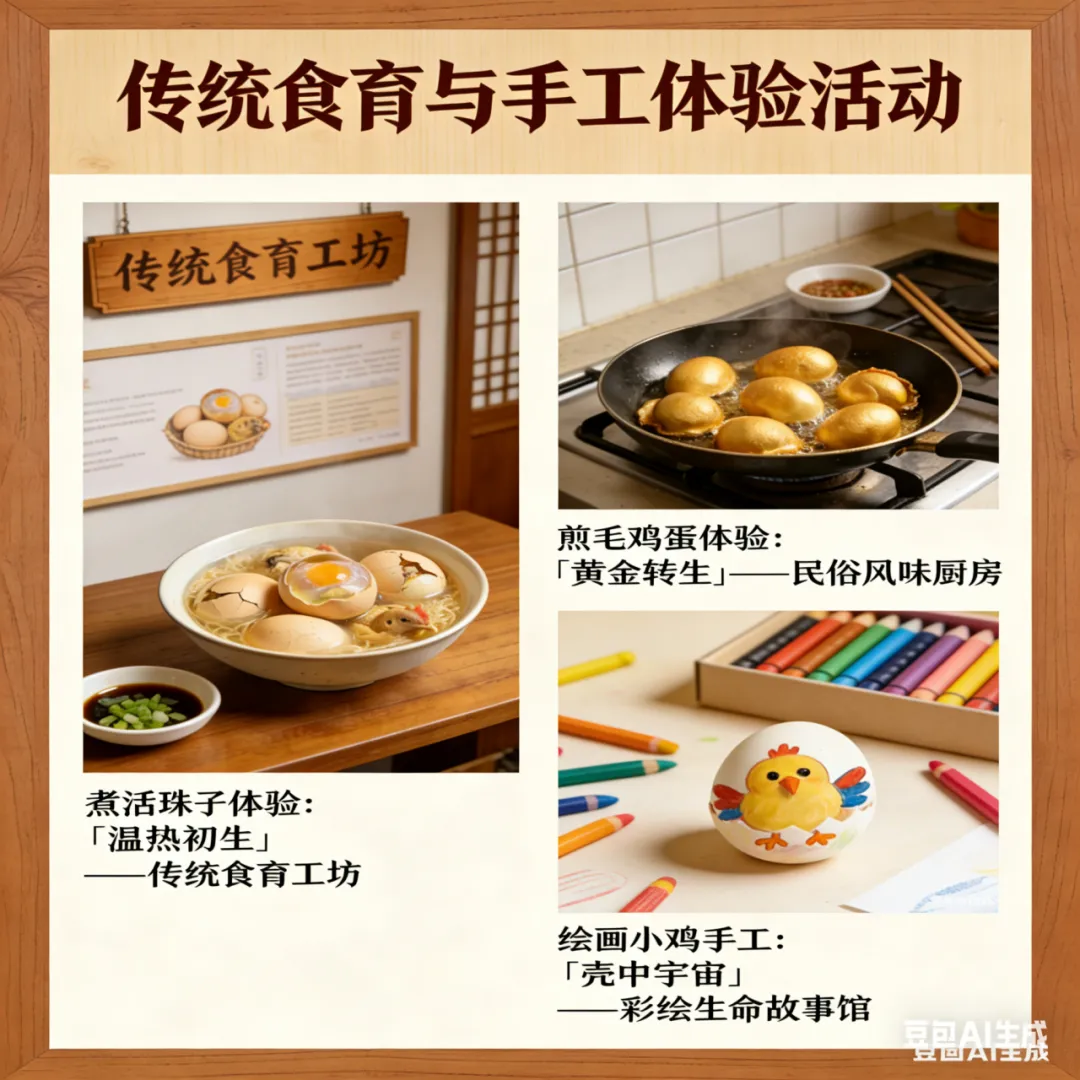 传统食育工坊:可亲身体验“煎毛鸡蛋”与“煮活珠子”,在民俗风味厨房中感受传统小食的温暖与趣味。