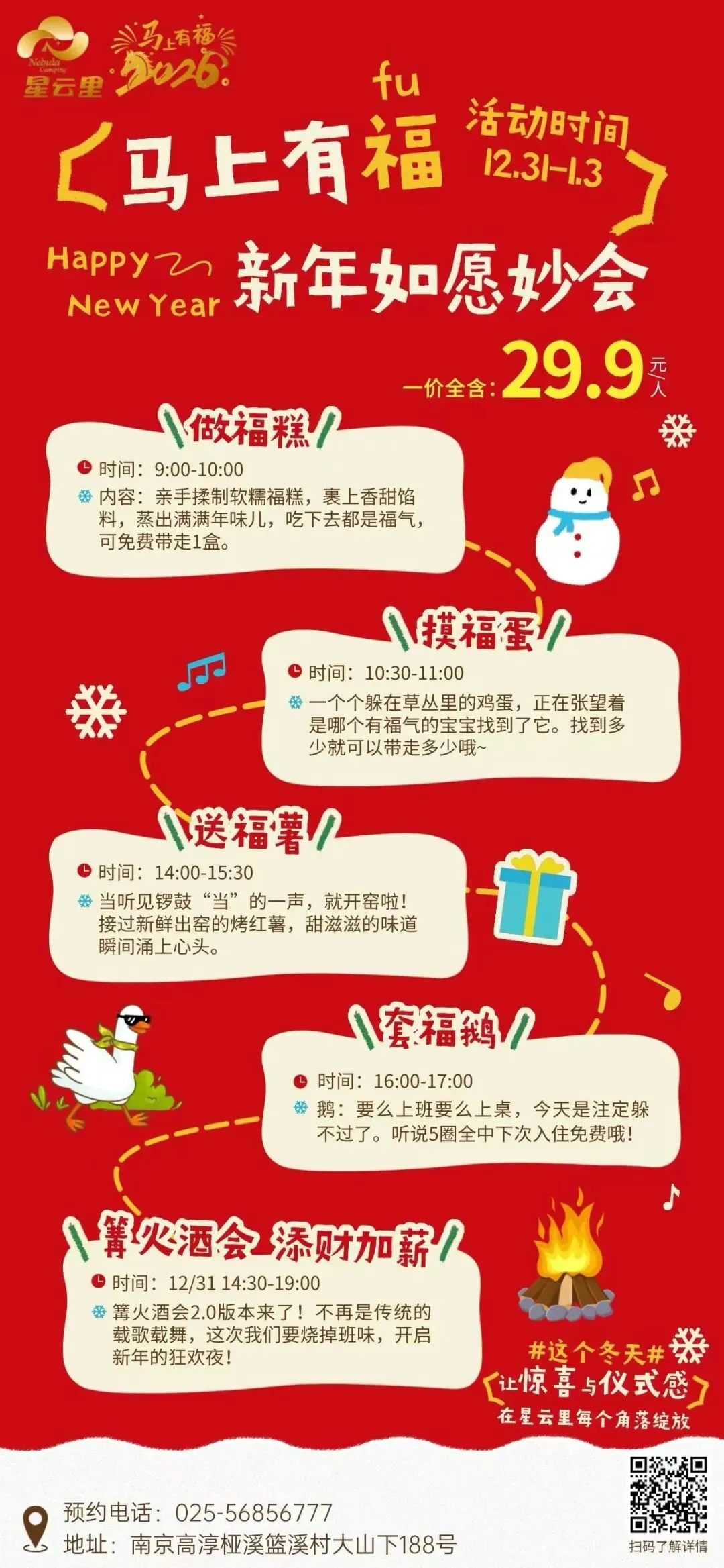 29.9元通玩5大项目:做福糕、摸福蛋、送福薯、套福鹅、篝火酒会,从早到晚欢乐不断。