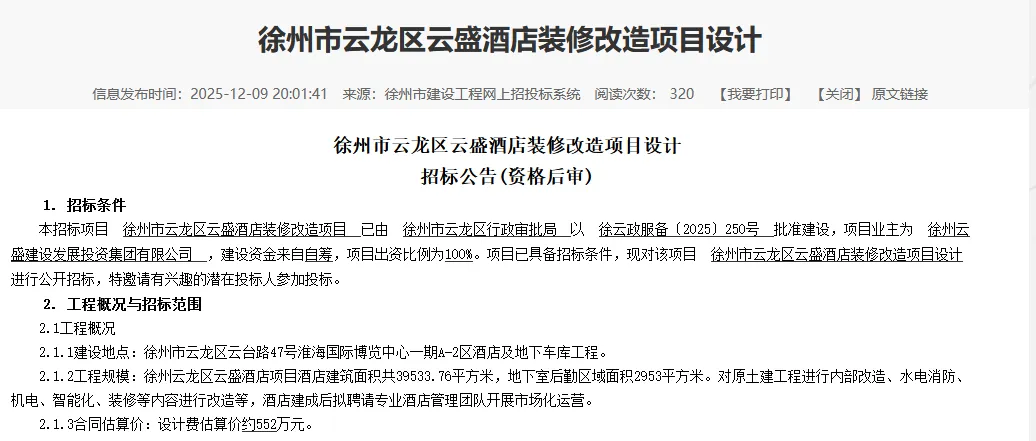 这不,又有一家全球50强酒店进驻徐州,位置也定了。就在今年7月份,云龙区与金陵饭店集团围绕淮海国际博览中心酒店项目进行深入沟通交流,并达成合作共识,标志着南京金陵饭店集团成功入驻淮海国际博览中心。南京金陵饭店集团,是全球酒店集团 50强、江苏省旅游业龙头企业,集团综合实力位居全球酒店集团、中国最具规模饭店管理公司前列。就在近日,徐州市云龙区云盛酒店装修改造项目招标发布,这个酒店就在淮海国际博览中心一期(新城区奥体北侧),也就是金陵饭店的位置。而且光设计费就高达552万元,从装修费就可以看出酒店规模不小,要不然也不会花这么多钱设计。根据规划根据项目定位,会展中心两栋塔楼拟导入金陵饭店集团的金陵大酒店、金陵嘉辰酒店、金陵嘉珑酒店三个主题品牌。其中,西塔楼导入“金陵大酒店”品牌,按五星级标准投资建造,作为新城窗口、城市会客厅功能定位,以接待高端商务(含政务)、会务为主、兼顾休闲度假旅游的高端全服务商务会议型酒店。东塔楼导入“金陵嘉辰酒店”和“金陵嘉珑酒店”品牌,作为会展及产业配套,以接待中高端商务为主、兼顾团队、休闲度假客旅游的中高端有限服务酒店。今年以来,邓紫棋、许嵩、蔡琴、金润吉、蔡健雅、彭佳慧、容祖儿、王心凌等众多明星都在徐州奥体开了演唱会,还举办了苏超比赛。像苏宁凯悦、喜来登等高档酒店都比较远。这次金陵酒店的入驻,可以填补新城区高档酒店空白,明星或许可能就近入住,不是更方便吗?再加上粉丝和球迷,以及旅游的人,未来这个酒店的生意不会差。避免失联,欢迎大家关注 “发现徐州”备用号“遇到徐州”
