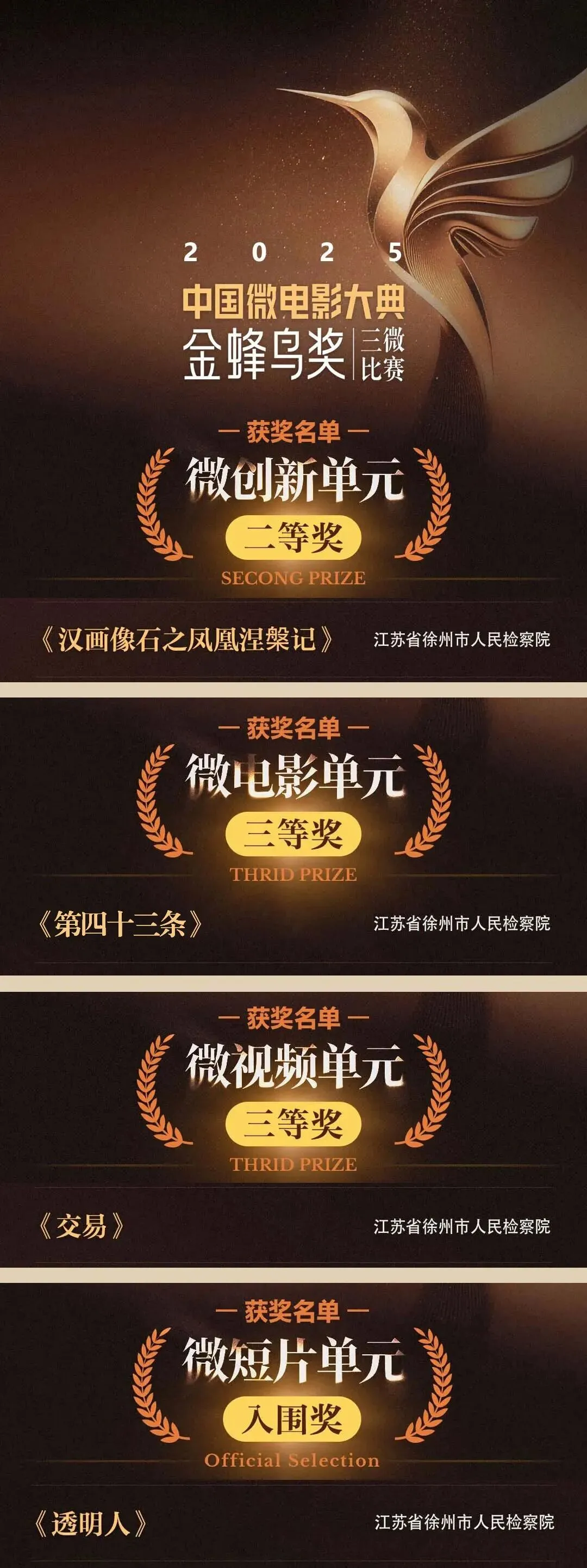近期,2025·中国微电影大典“金蜂鸟奖”三微比赛结果公布。徐州检察机关作品《汉画像石之凤凰涅槃记》获“微创新单元”二等奖;《第四十三条》获“微电影单元”三等奖;《交易》获“微视频单元”三等奖;《透明人》获“微短片单元”入围奖。