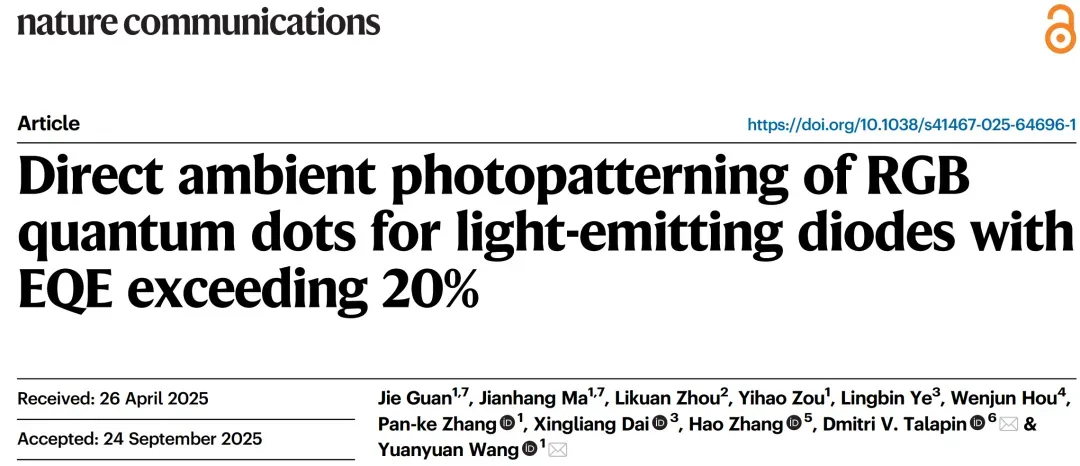 Guan, J., Ma, J., Zhou, L. et al. Direct ambient photopatterning of RGB quantum dots for light-emitting diodes with EQE exceeding 20%. Nat Commun 16, 9689 (2025).