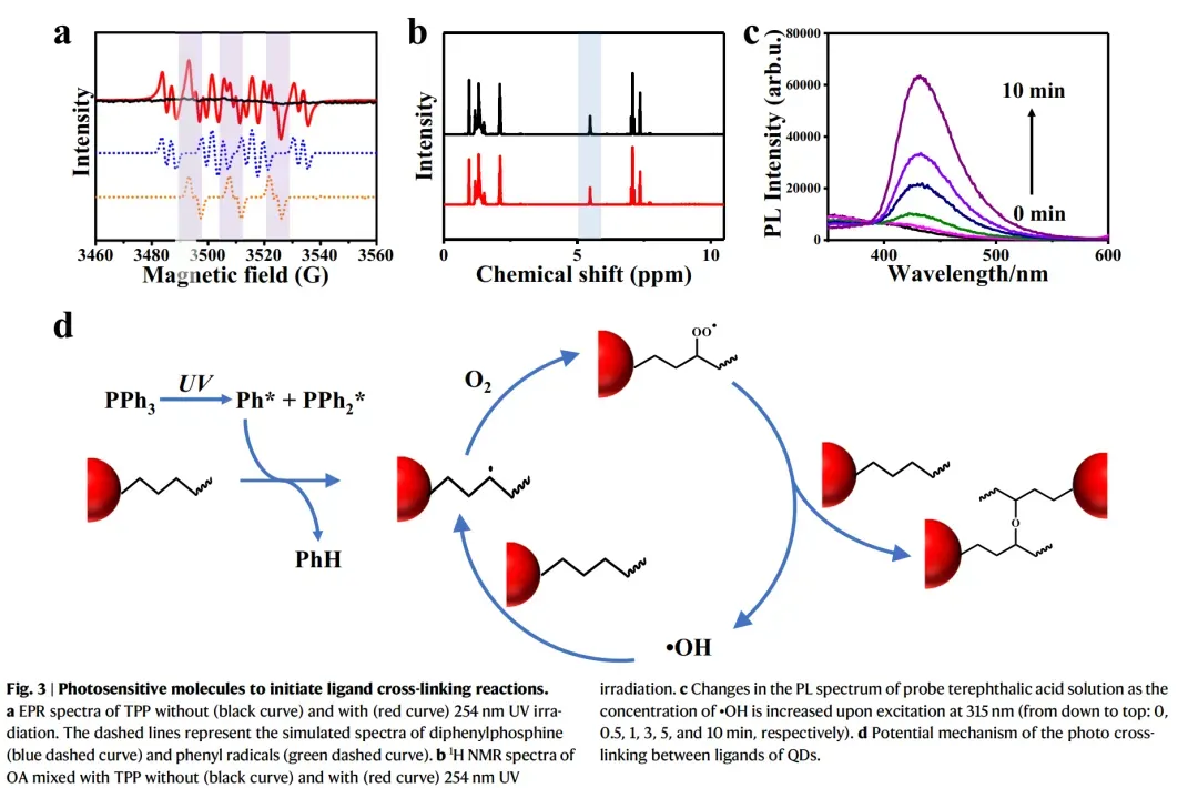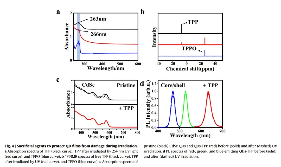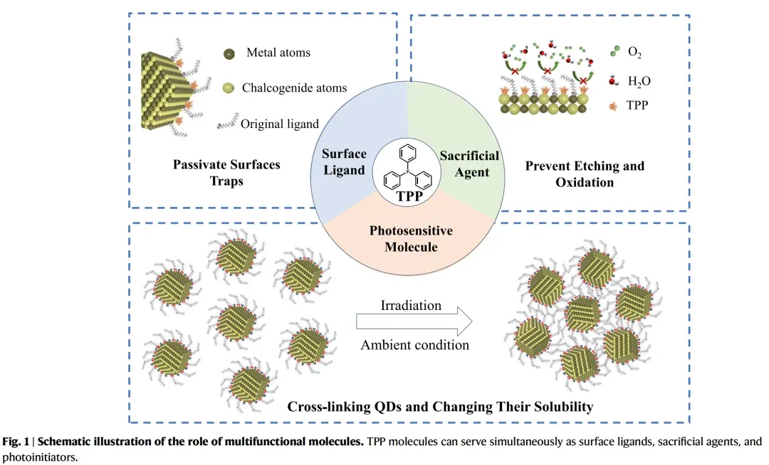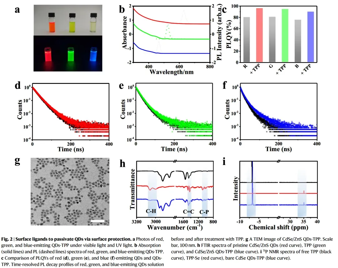 在各种配体体系中,含磷分子长期以来在量子点化学中扮演着核心角色,特别是在合成和表面工程中。代表性的例子如三辛基膦和三苯基膦通常用作量子点生长过程中的配位溶剂和还原剂,以及作为提高光致发光效率和胶体稳定性的表面钝化剂。TPP因其适度的给电子能力、化学稳定的芳香结构和紧凑的分子尺寸而受到关注,所有这些都有助于其与各种量子点成分的优异兼容性。尽管有这些优点,TPP在后合成量子点处理中的潜力在很大程度上仍未得到探索。