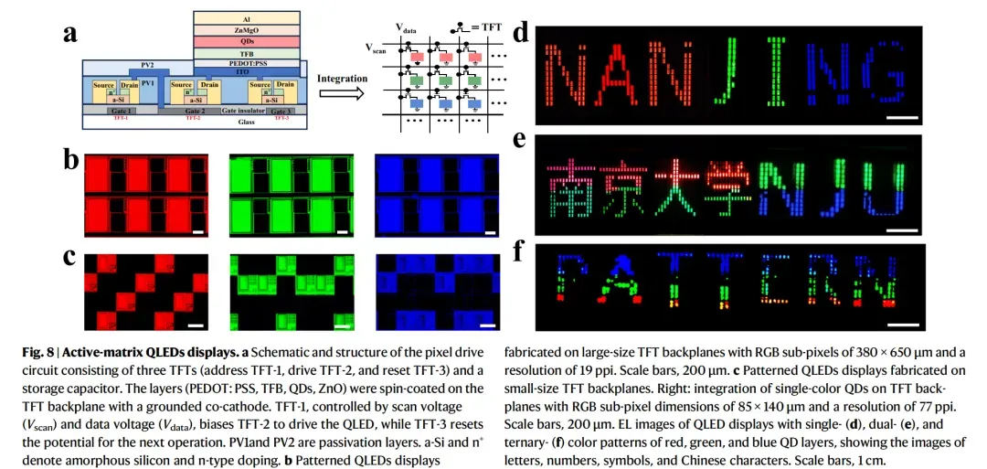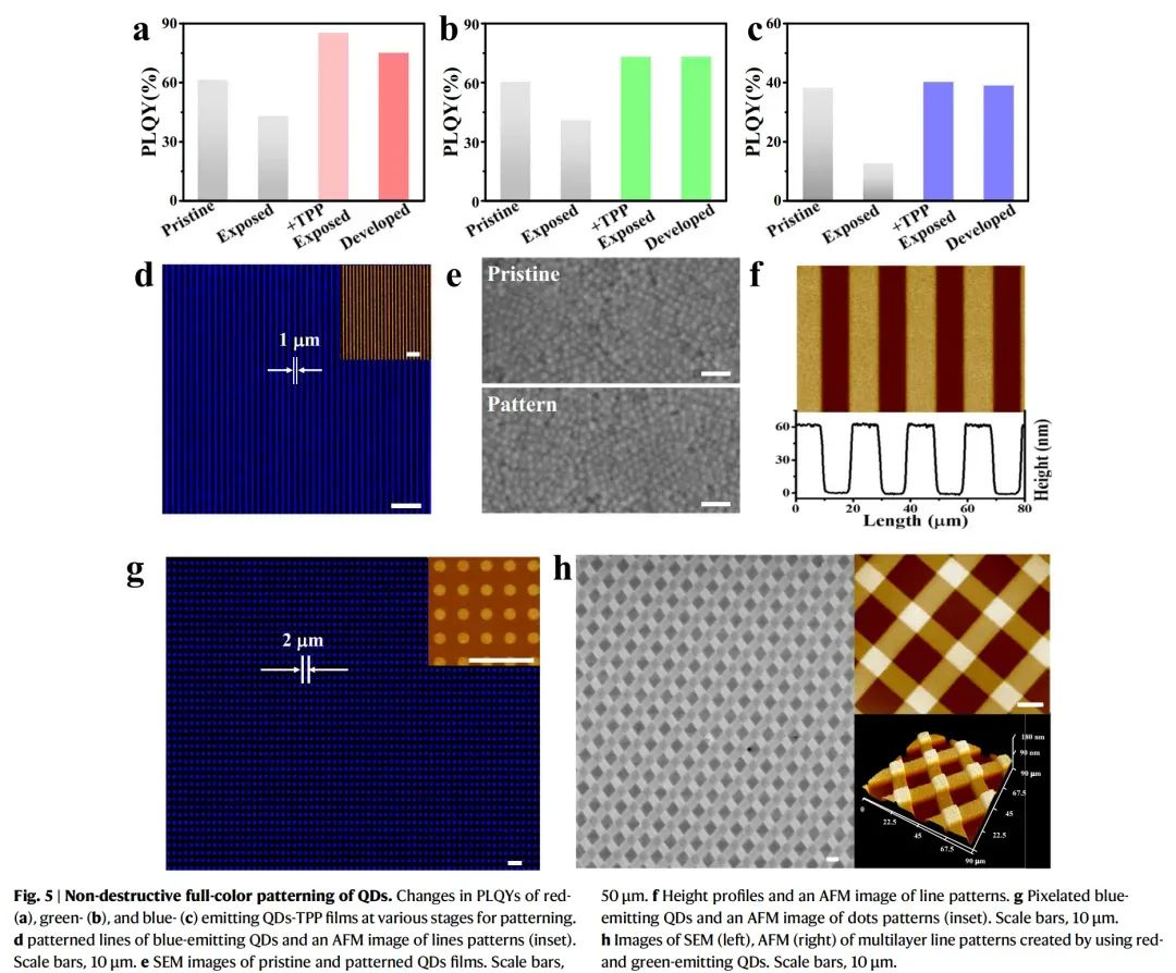 南京大学王元元 & 芝加哥大学Dmitri V. Talapin等人提出了一种分子水平的多功能图案化策略,用于在环境条件下直接进行量子点的光学光刻。该策略将表面钝化、氧化保护和光活化集成到单一的小分子设计中。该设计克服了传统光敏配体在空气中失活的局限性,无需惰性气氛即可实现高分辨率、非破坏性的图案化。在紫外光照射下,TPP经历氧介导的光活化,触发协同的光诱导反应,从而实现量子点溶解度的空间精确调控。这种机制允许图案化分辨率达到9534 dpi,同时保持量子点的结构和光学完整性。利用这一策略,我们制造了高性能的RGB图案化QLED,蓝色QLED的EQE达到21.6%,绿色和红色分别为25.6%和20.2%。此外,我们通过将RGB阵列与薄膜晶体管背板集成,展示了完全基于直接光学图案化量子点的全彩色有源矩阵QLED显示器。重要的是,这项工作标志着蓝色量子点直接图案化及其与TFT电路集成的成功演示。该方法还在不同像素尺寸(包括85×140 μm和380×650 μm)上与TFT背板表现出优异的兼容性,突显了其在多功能器件制造方面的强大潜力。这项工作连接了实验室规模的分子设计与实际的器件工程,为下一代电致发光QLED显示器制造提供了一种可扩展、经济高效且环境兼容的解决方案。
