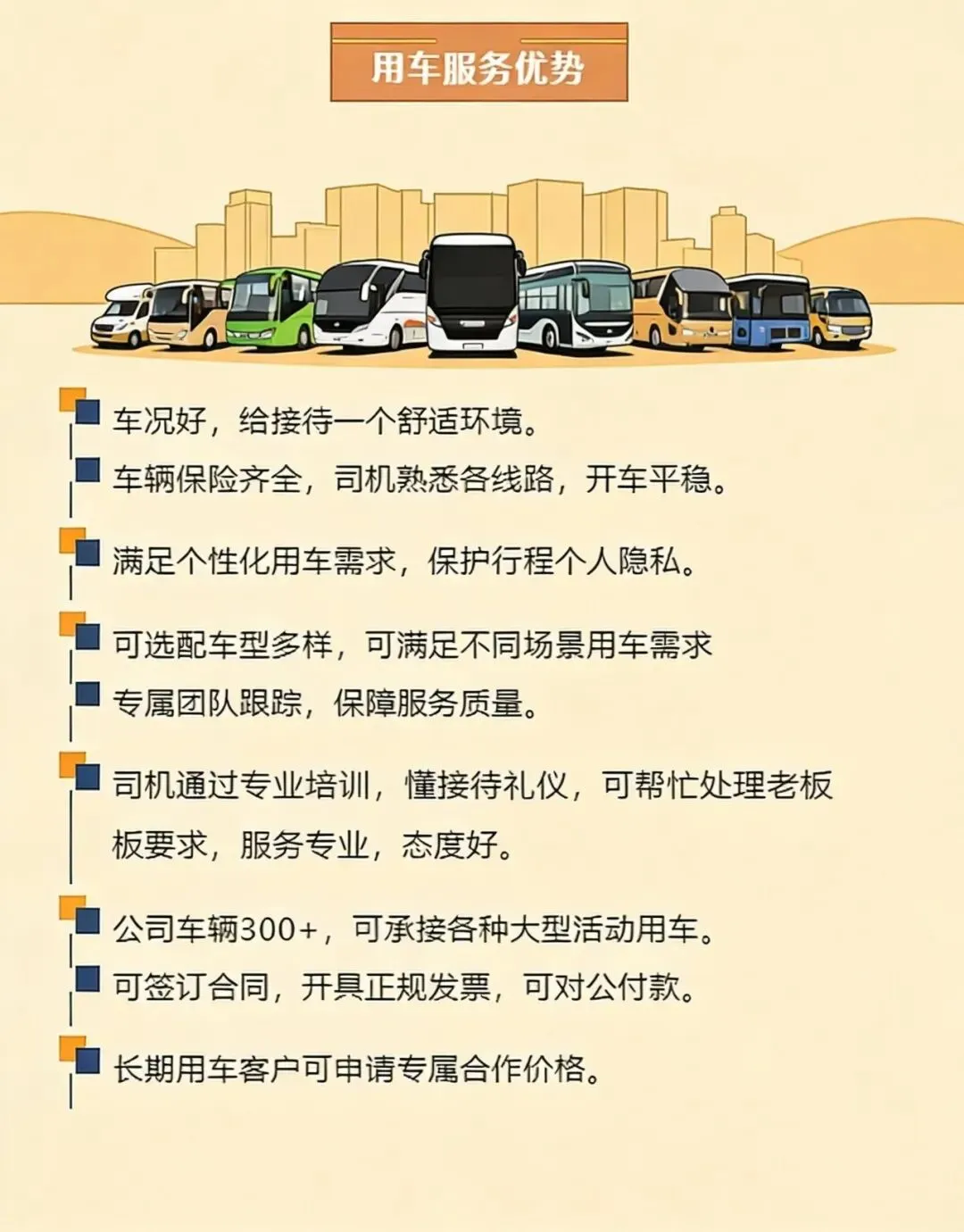 旅游包车、团建用车、商务接待、公务出行、部队接送、婚礼接送、单位用车、企业用车、个人包车、通勤班车、明星拍摄用车、学校学生把车、长短途跨省用车、大型活动用车、机场火车接送