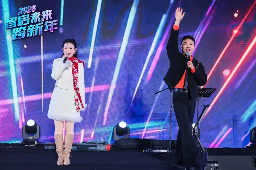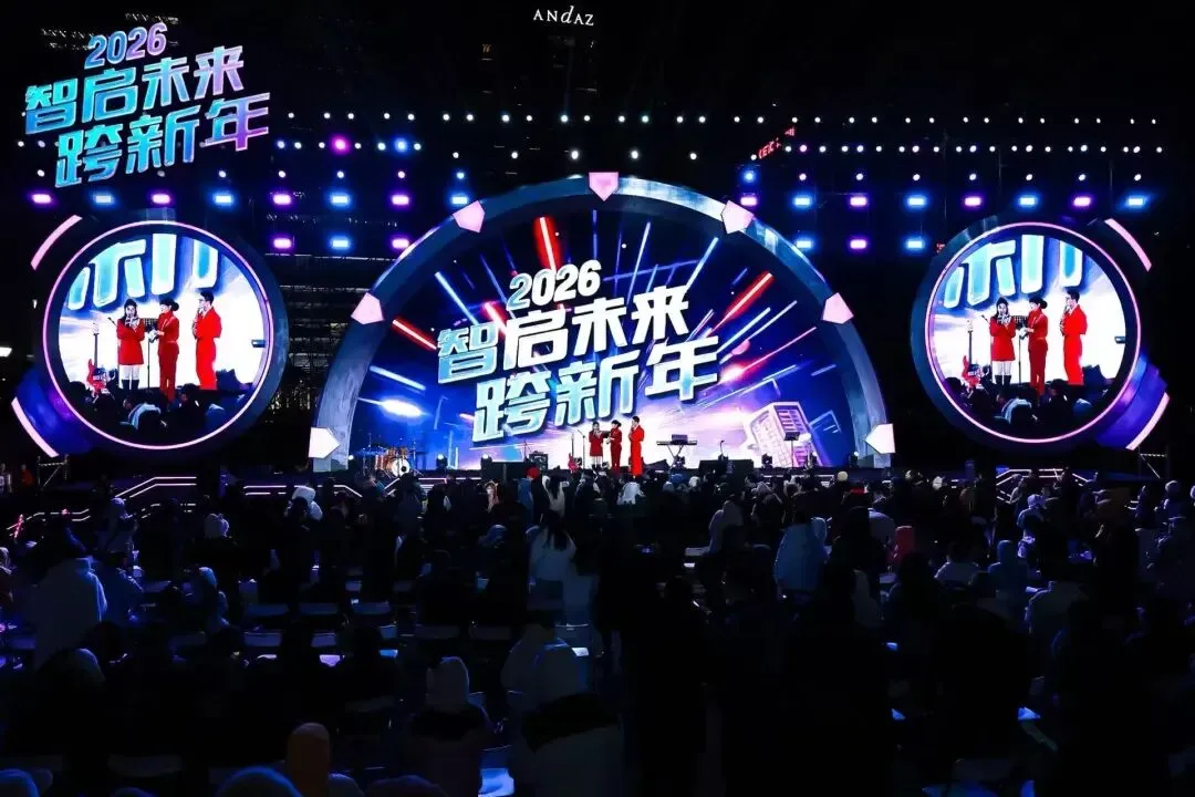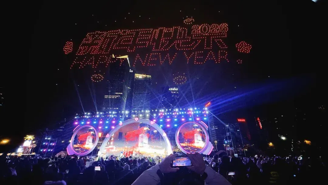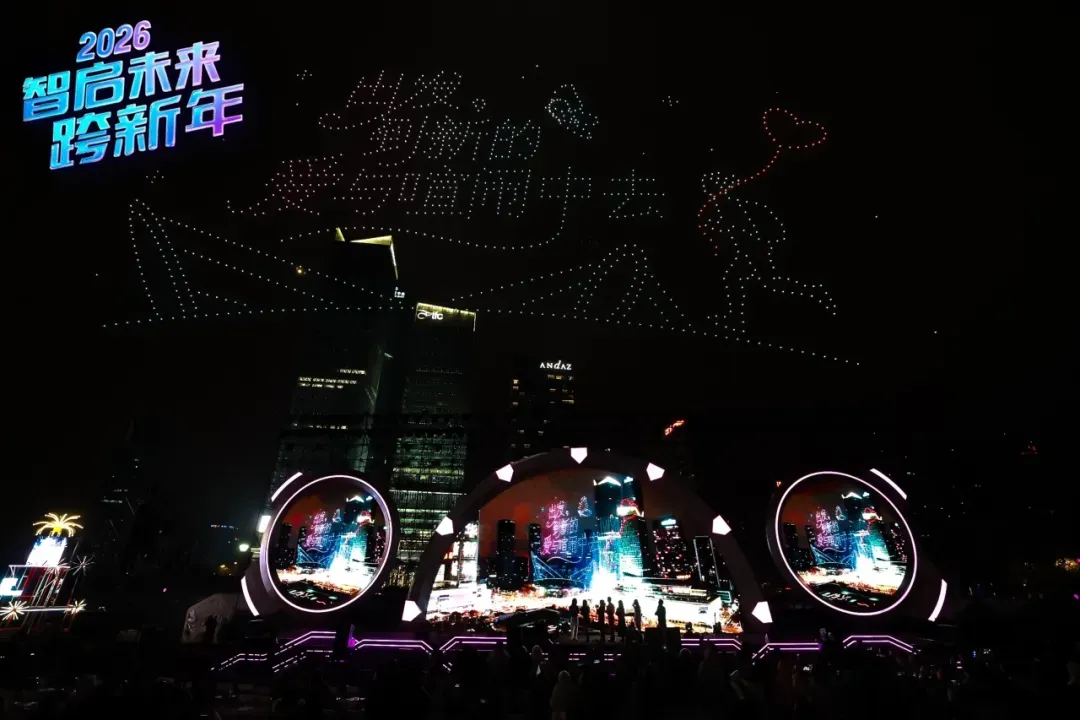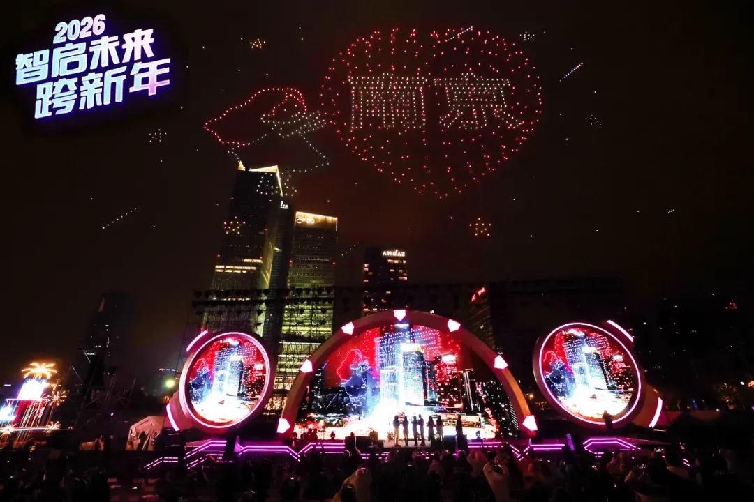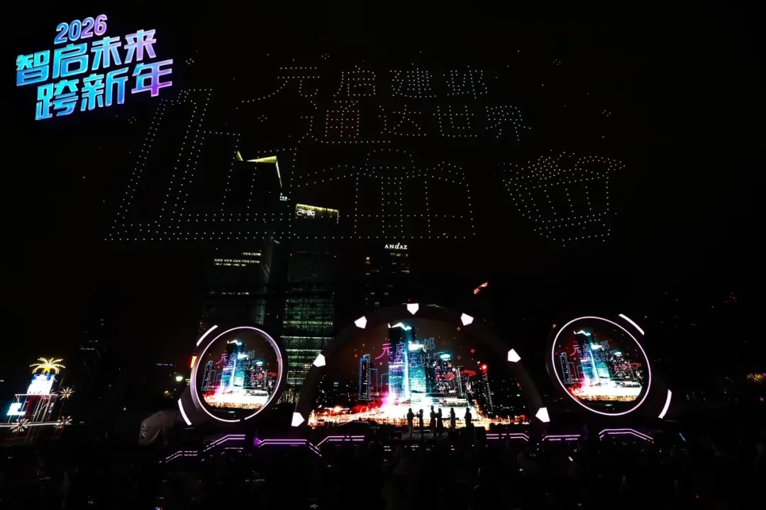 无人机点亮天幕。1000架无人机腾空而起,流光织就璀璨天幕,光影流转间引得全场惊呼不断,在这激动人心的时刻,全场倒计时,在大家的拥抱欢呼中,在漫天欢呼声中,我们一起迎接崭新的2026。