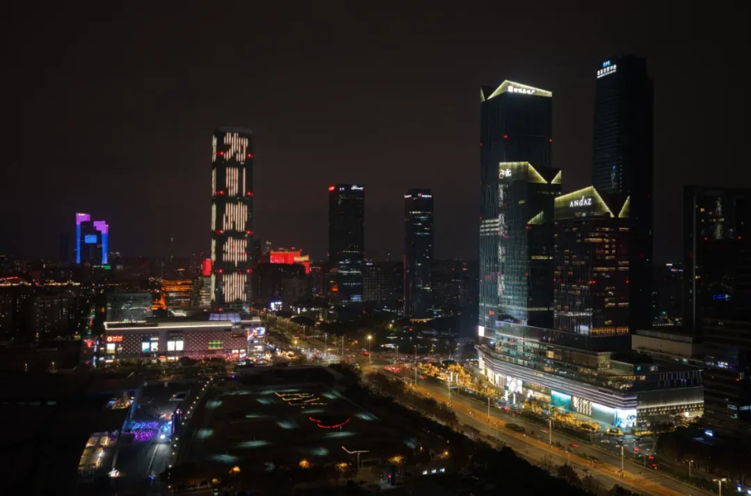 楼宇点亮夜色。元通商圈主要大楼同步点亮璀璨灯光,华采天地、ifc等地标建筑在零点同步亮起,连片光影照亮夜空。