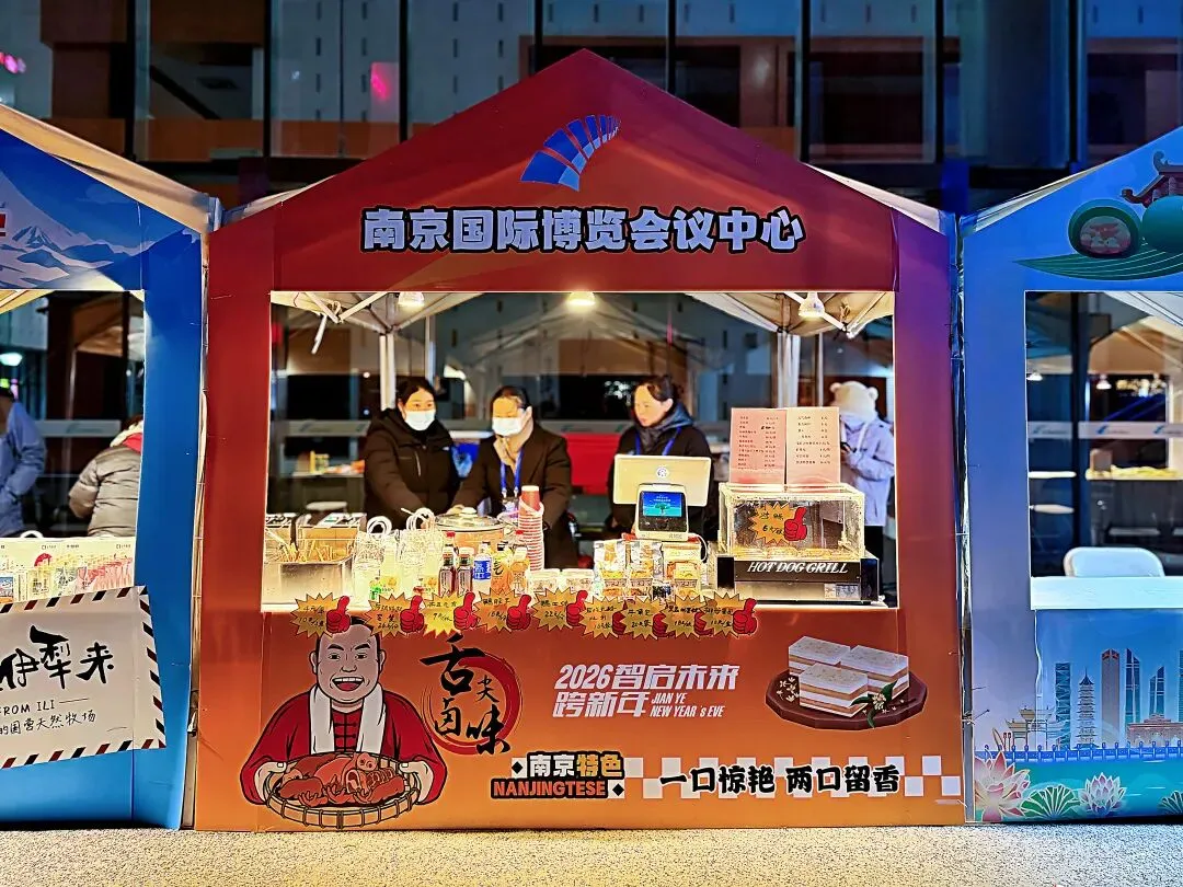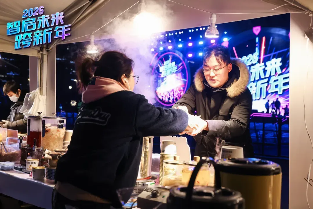 河西集团南京国际博览会议中心与国际青年酒店在现场设立特色市集展位,吸引了众多市民驻足。手作面包、本地传统卤味、精酿啤酒、饮品特调......摊位前人流持续不断,以温暖食味陪伴市民迎新,成为跨年夜里一份亲切的味觉陪伴。