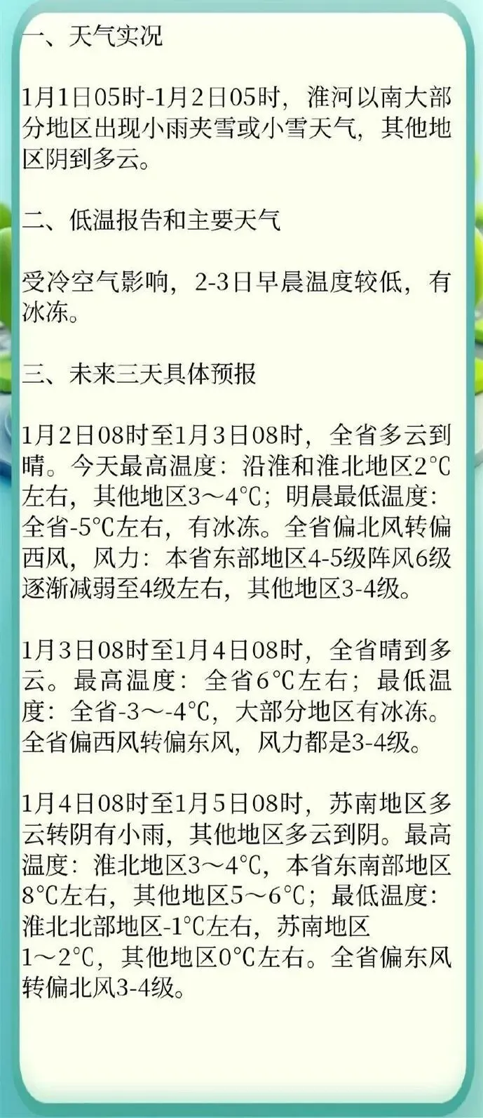 沿江及苏南地区温度基本在-2℃到0℃左右