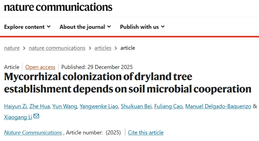 近日,南京林业大学曹福亮院士团队李孝刚教授在《Nature Communications》发表题为《Mycorrhizal colonization of dryland tree establishment depends on soil microbial cooperation》的研究论文。南京林业大学为论文第一完成单位,生态学博士研究生自海云为论文第一作者,李孝刚教授为论文通讯作者。研究工作得到国家自然科学基金重点项目(32430069)、国际合作项目(W2412011)以及江苏省碳达峰、碳中和技术创新专项基金(BE2022420)等资助。