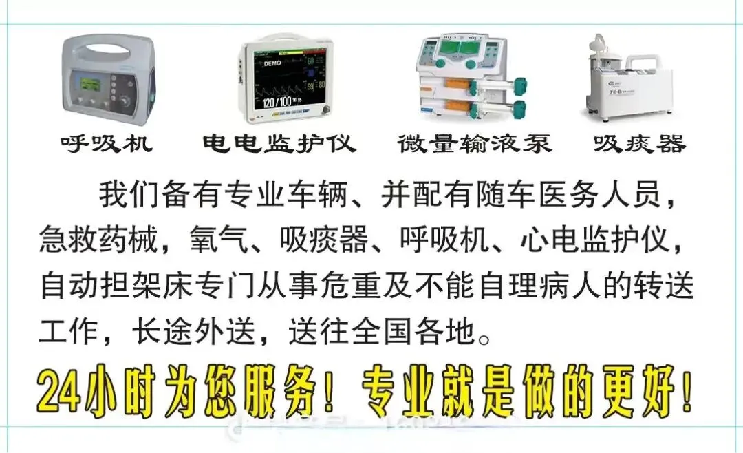 - 长途护送:针对跨市/跨省转院、危重患者返乡等需求,配备专业医护团队及ICU级设备(呼吸机、心电监护仪等),全程监测生命体征,确保长途运输安全。