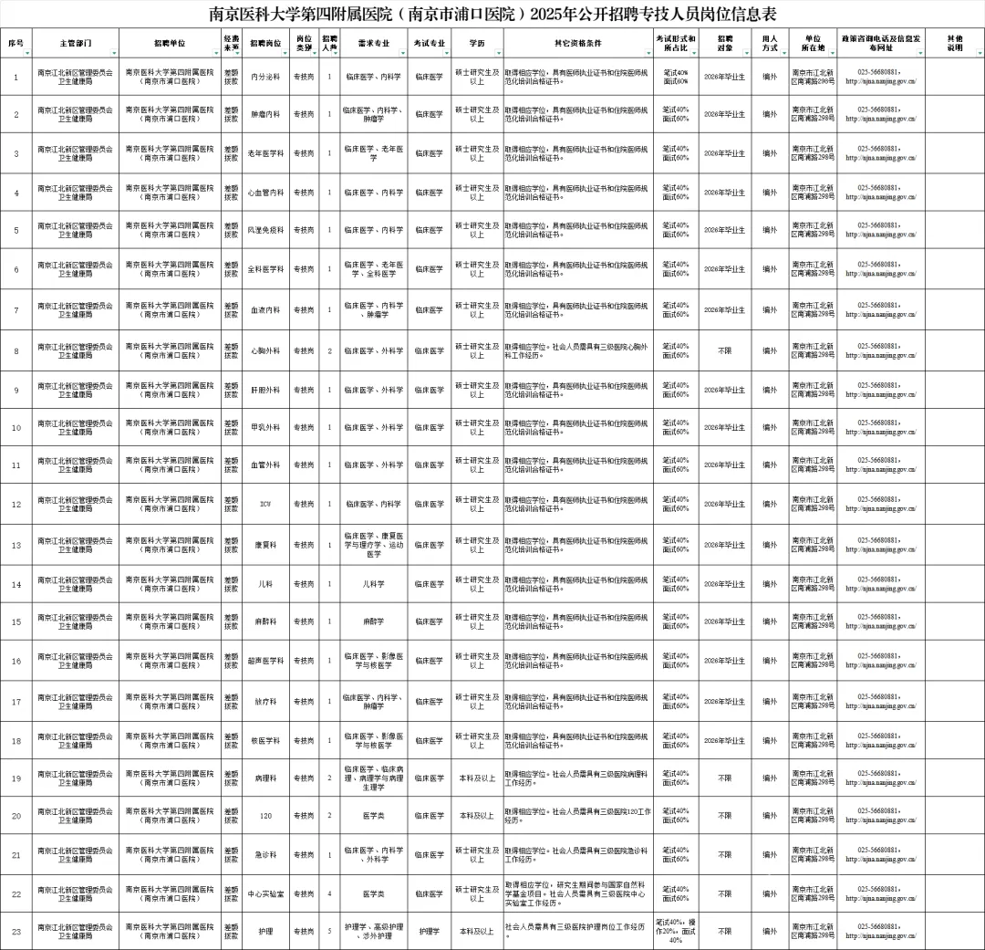 本次招聘相关信息在南京江北新区管理委员会网(http://njna.nanjing.gov.cn/)以及南京医科大学第四附属医院(南京市浦口医院)网站(http://www.jsnydsfy.com/)上发布。具体的招聘岗位、数量、资格条件等详见《南京医科大学第四附属医院(南京市浦口医院)2025年公开招聘专技人员岗位信息表》(以下简称《岗位信息表》)。