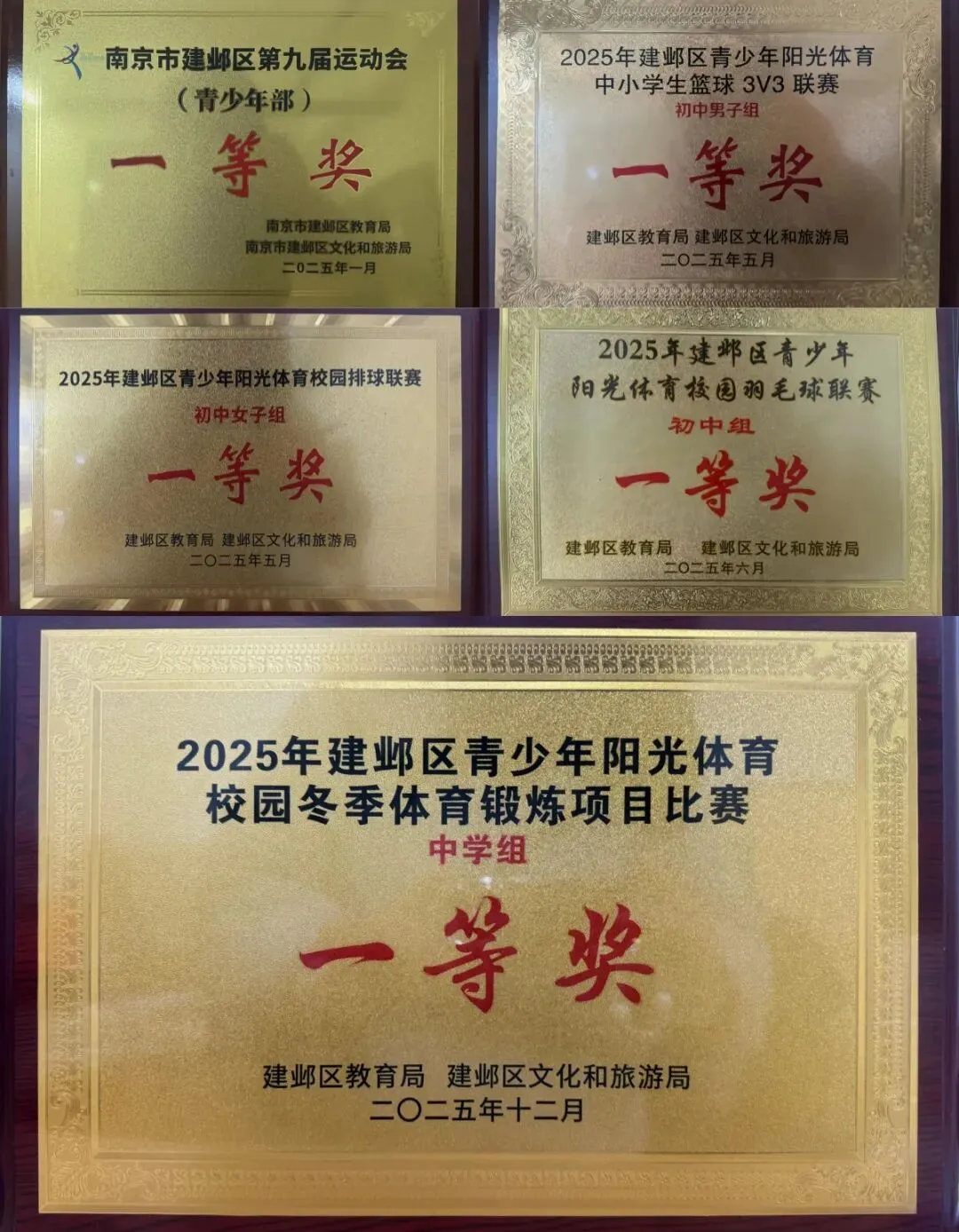在2025年建邺区青少年阳光体育校园篮球3v3联赛中,张博译等5人获市二等奖、区一等奖;