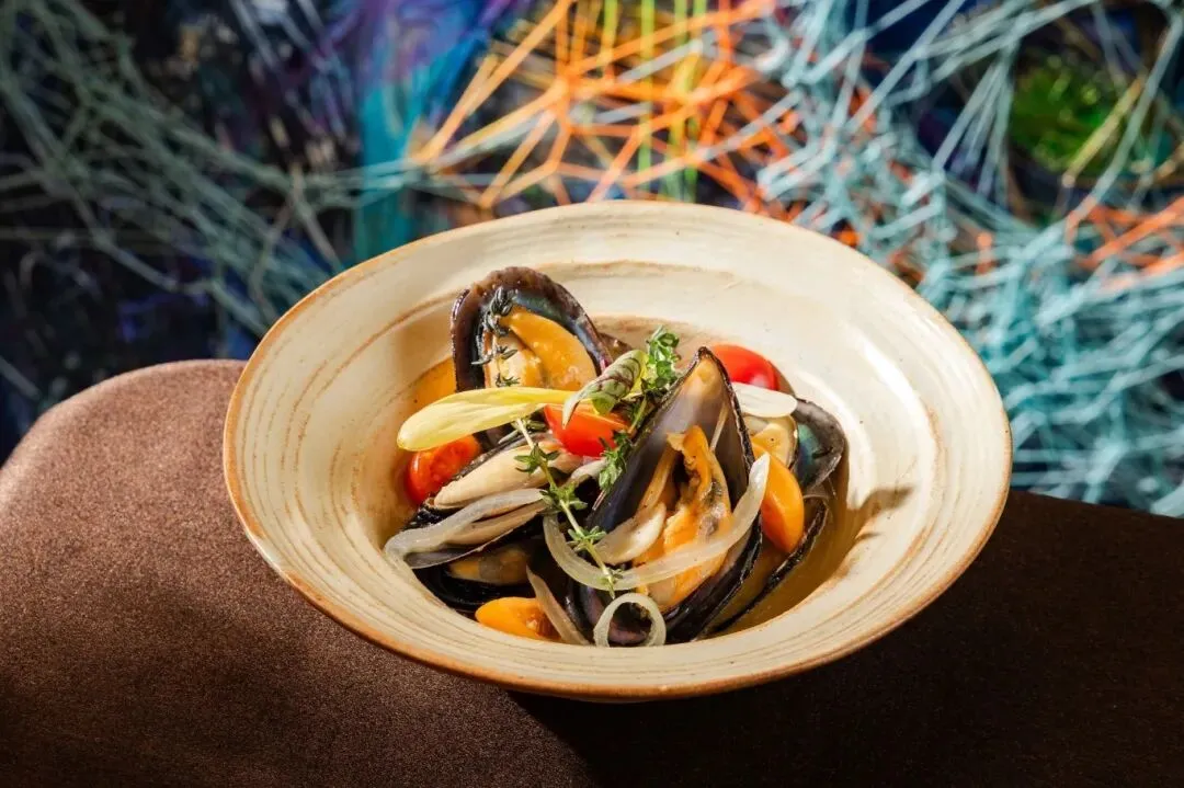 夹起一只饱满的青口,外壳泛着诱人的光泽