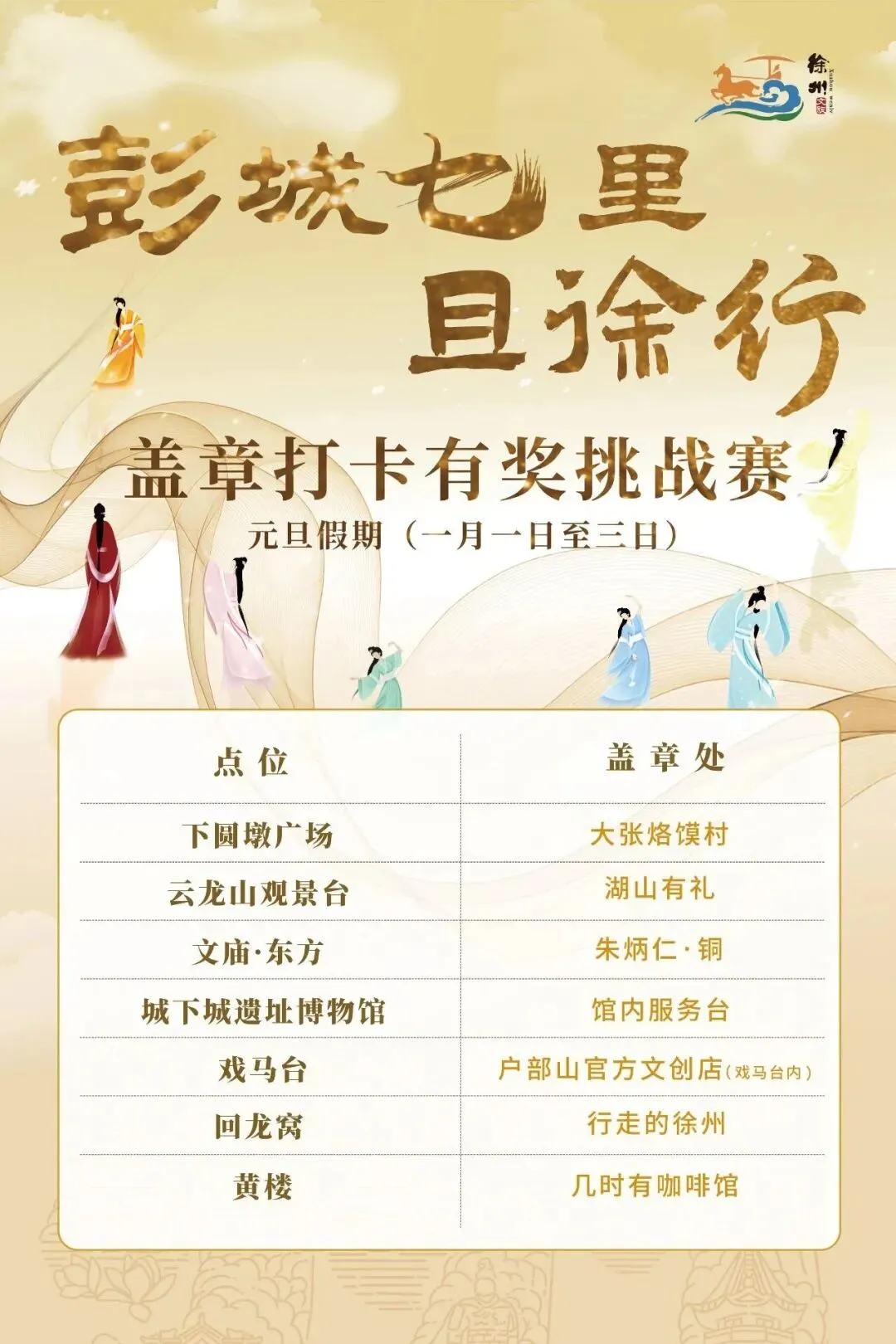 元旦期间,“彭城七里·且徐行”盖章打卡挑战赛上线。手持地图,漫步七里,在七大文化地标收集定制印章,把千年文脉“盖”回家。