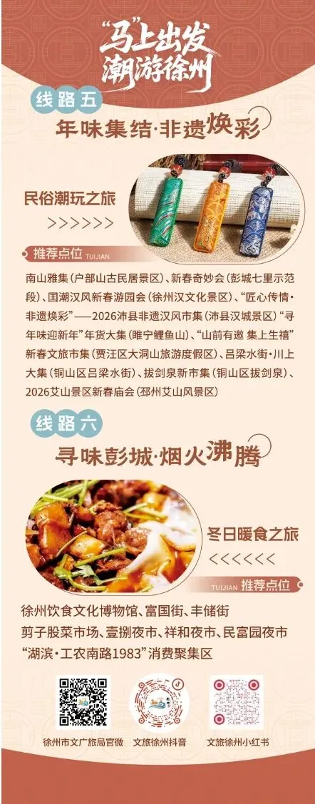 5小时不间断,11位县市区文旅推介官轮番登场,带你云游徐州:在鼓楼探秘“东方金字塔”龟山汉墓;在云龙漫步户部山,邂逅项羽的豪情与苏轼的月光;在泉山看面塑传承人“掌中山河”的绝技;在贾汪体验“冰雪+草莓+炒鸡”的冬日三重奏;在沛县感受“大风起兮云飞扬”的汉魂气魄……
