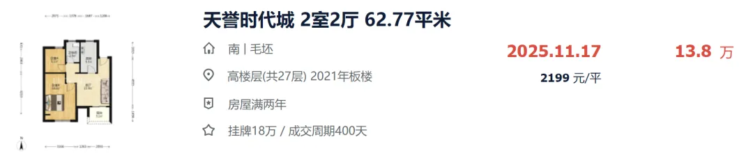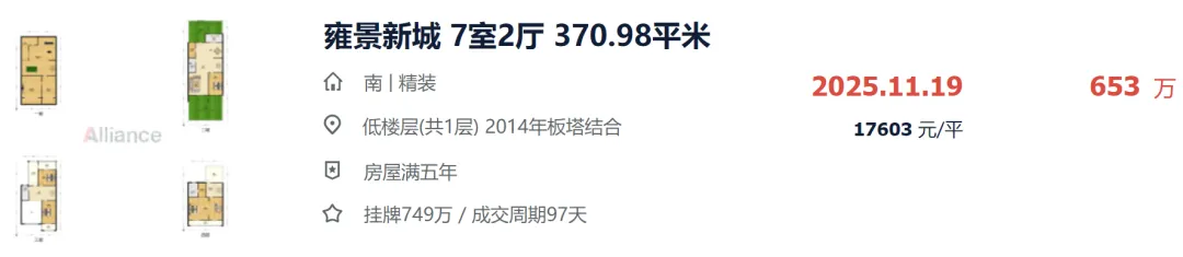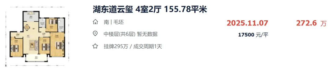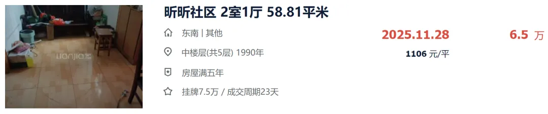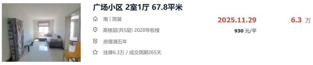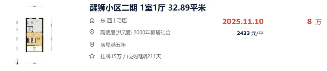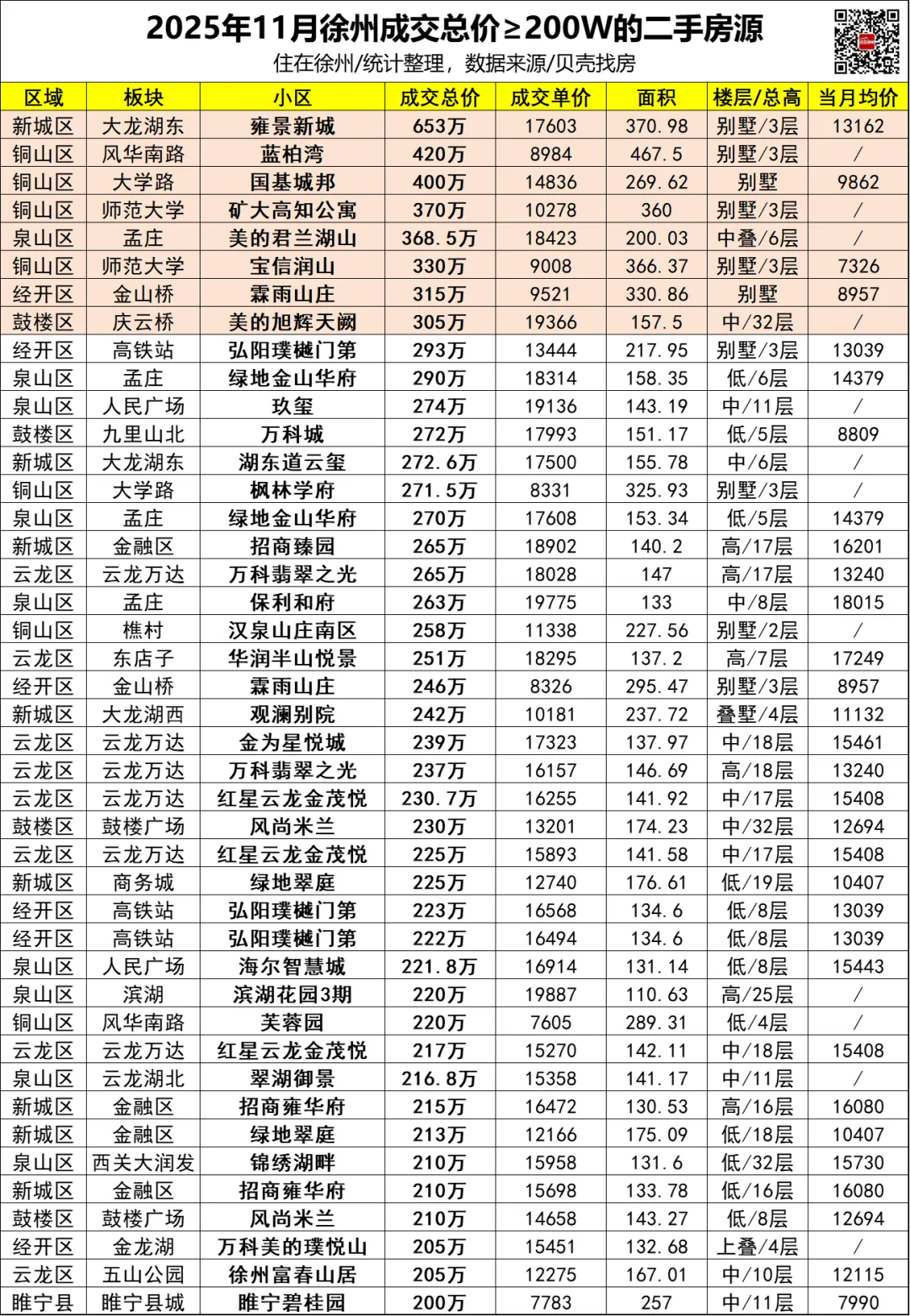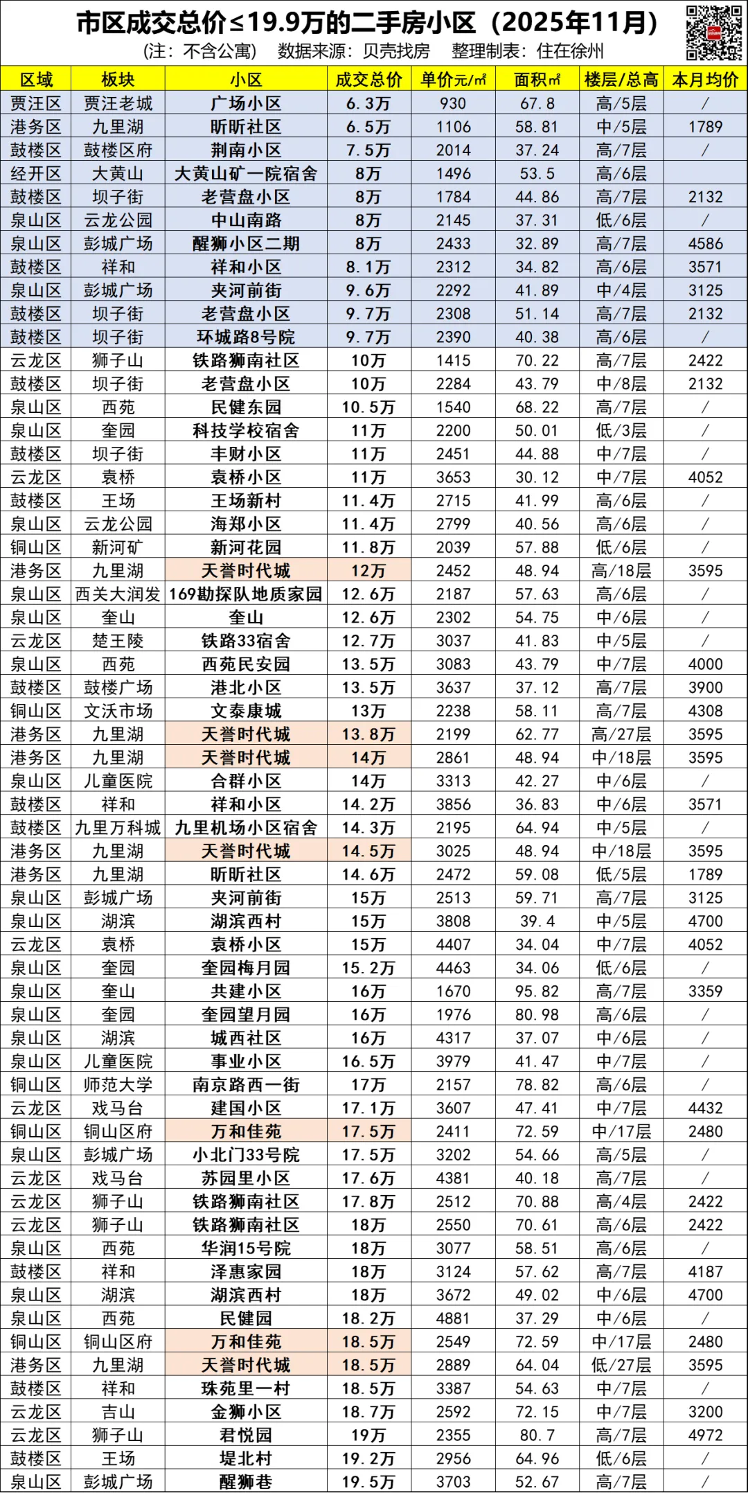 徐州市区买房的总价跨度有多惊人?高的能到600多万,低的只要6万多/套!贝壳找房成交记录显示:2025年11月份,成交总价最低的一套房,贾汪城区只要6.3万元!市中心彭城广场一套老小区只要8万!而成交总价最高的,新城区一套叠墅高达653万万!总价超300万的共有8套。11月份,成交总价≤19.9万的二手房共有60套(不含公寓),比上月少1套!最便宜的一套总价仅6.3万!又刷新最低总价记录。其中,总价≤9.9万的房子,共成交11套!遍布全市各区。贾汪老城区的广场小区,67.8㎡户型,总价仅6.3万,单价仅930元/㎡,又刷新了徐州最低总价记录。港务区九里湖北的昕昕社区,58.81㎡户型,总价仅6.5万,单价1106元/㎡。鼓楼区政府板块的荆南社区,37.24㎡户型,总价7.5万,单价2014元/㎡,为主城区最便宜的一套。市中心彭城广场旁醒狮小区2期这套32.89㎡二手房,总价竟然只要8万!做民宿不香吗?大家认为怎么样?最惊诧的是,竟然还有次新商品房!九里湖鱼先生的社区(天誉时代城),当月共有5套,成交总价不到20万!其中总价最低的才12万/套!单价最低的仅2199元/㎡!要知道,鱼先生的社区首批上房才5年。同样的户型,2021年峰值成交价9509/㎡!跌幅多少,大家自己算算……一边是有人为6万多的 “蜗居”精打细算 ,一边却有人果断入手600多万的豪宅!徐州二手房市场的冰火两重天,在这个月体现得淋漓尽致。11月份,成交总价≥200W/㎡的二手房涉及33个小区,共成交43套,比上月又增加1套!其中超过300W/㎡的有8套。新城区大龙湖东雍景新城别墅,371平,总价653万!成交单价17603/㎡。