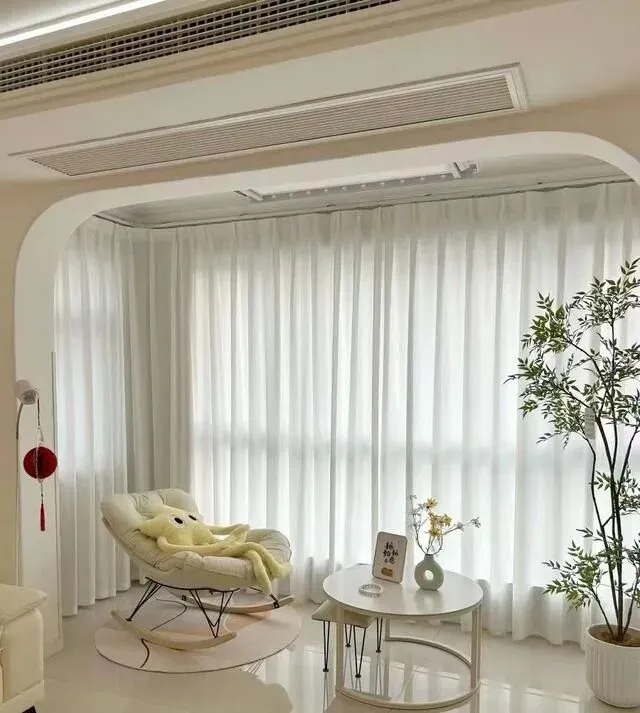 阳台和客厅之间做了个拱形门 , 挂白纱窗 , 旁边一盆绿植。
