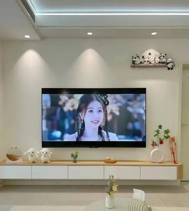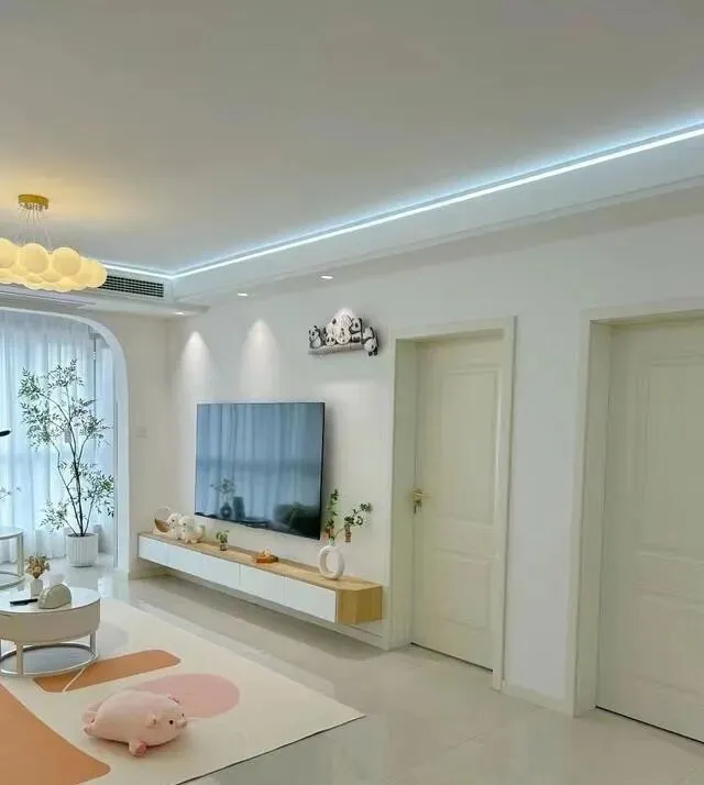 电视墙没做满墙柜子 , 就一个悬空小电视柜藏电线 , 背景墙用山丘射灯点缀。