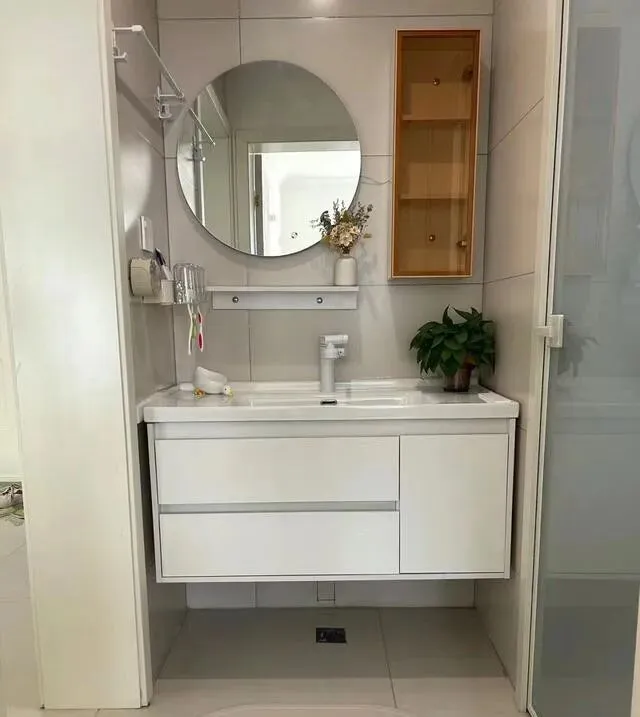 浴室柜是定制的 , 提前量好墙距 , 严丝合缝。