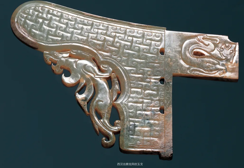 这件是徐州博物馆藏的西汉出廓龙凤纹玉戈,出土于徐州狮子山楚王墓,是西汉早期玉礼器中的巅峰之作。