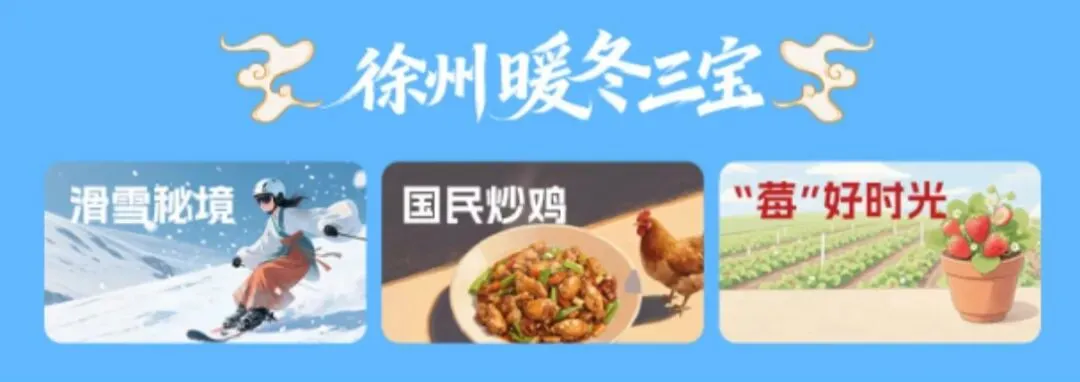 此次特别推出的“徐州暖冬三宝”板块,涵盖滑雪秘境、国民炒鸡、"莓"好时光三大特色体验。汇集贾汪区大景山、督公山、茱萸山及铜山园博园多个滑雪场,以及凤鸣海“童话雪乡”、松鼠咔咔戏雪乐园等主题园区,丰富冰雪娱乐供给。依托贾汪、铜山、经济开发区等地的草莓产业园与现代化休闲农场,推出冬季农事采摘活动。并以磨石塘炒鸡一条街为代表,串联徐州地锅鸡、蒜爆鱼、烧烤等美食IP,赋能“冰雪+田园+美食”融合业态提质升级。