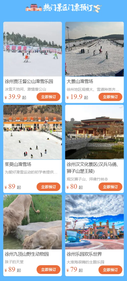 “热门景区门票预订”板块聚焦滑雪及特色体验需求,可实现产品一键预订。今冬徐州升级专业雪场设施,并打造“童话雪乡”等沉浸场景,既丰富亲子与户外体验,也延伸冰雪消费链条,有力助推本地高端滑雪品牌建设。