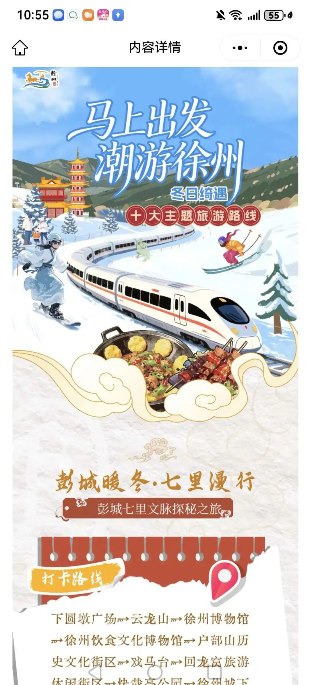 为顺应冬季旅游消费需求,提升徐州冰雪旅游品牌影响力,徐州市文化广电和旅游局联合同程旅行搭建徐州文旅品牌旗舰馆。旗舰馆以“滑走烦恼 刷遍徐州”为主题,围绕徐州冬季冰雪、温泉、采摘、美食等旅游资源,通过线上一站式服务平台,持续优化游客出行体验,进一步激发冬季文旅市场活力。