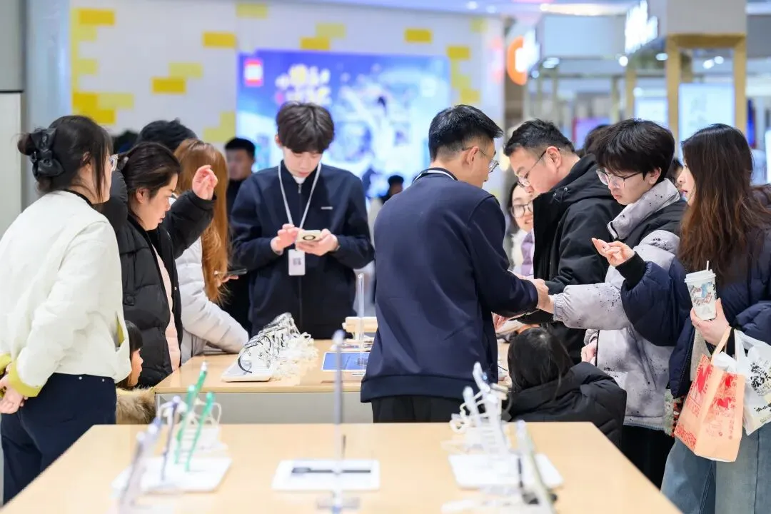 1月1日起,2026年消费品以旧换新补贴政策正式实施,在徐州苏宁广场华为智能生活馆,众多消费者在选购数码产品,标志着新一轮促消费、扩内需、惠民生的国家行动在徐州落地见效。