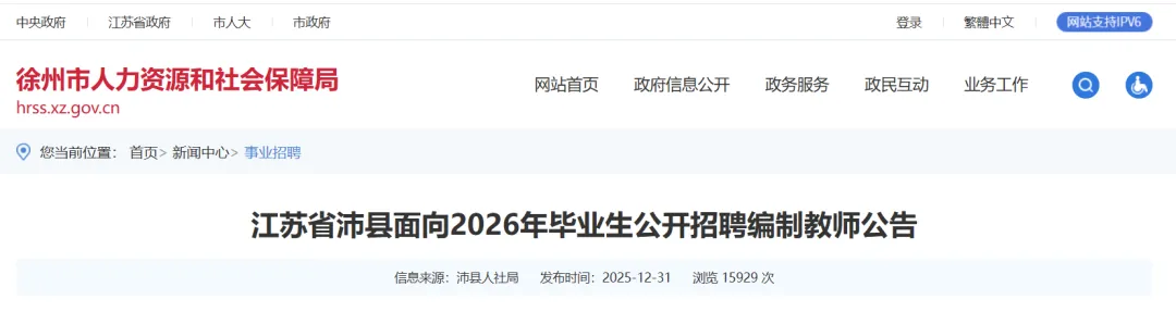 公开招聘教师公告、岗位信息在徐州市人力资源和社会保障网(https://hrss.xz.gov.cn/)、沛县人民政府网站公示公告栏目(http://www.px.gov.cn/xwzx/001007/subPage.html)上进行发布,具体的岗位名称、招聘人数、招聘对象、资格条件等详见《江苏省沛县面向2026年毕业生公开招聘编制教师岗位表》(以下简称《岗位表》)。