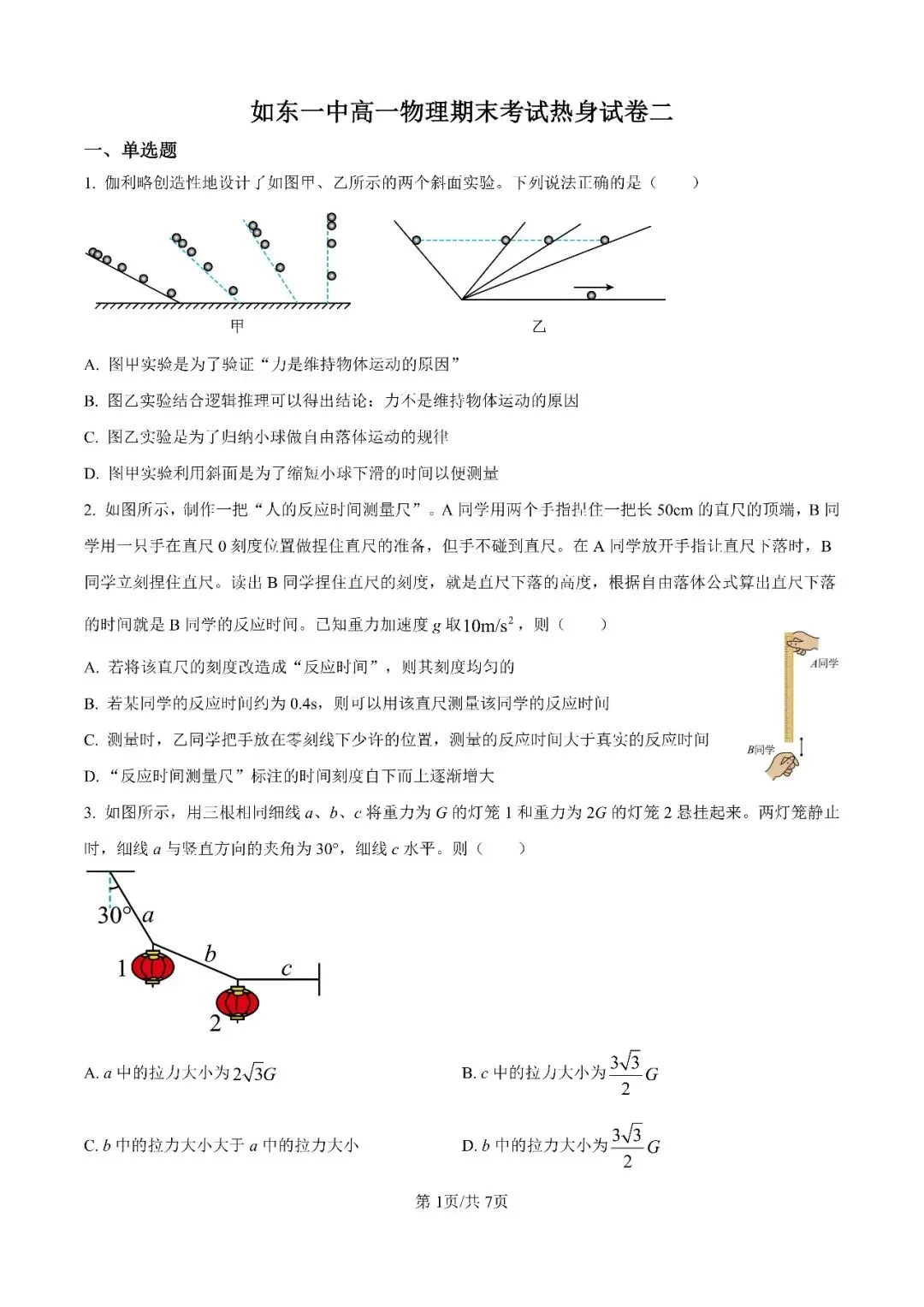 >江苏省如东县第一中学、宿迁一中、徐州中学2024-2025学年高一上学期期末训练(二)物理试题