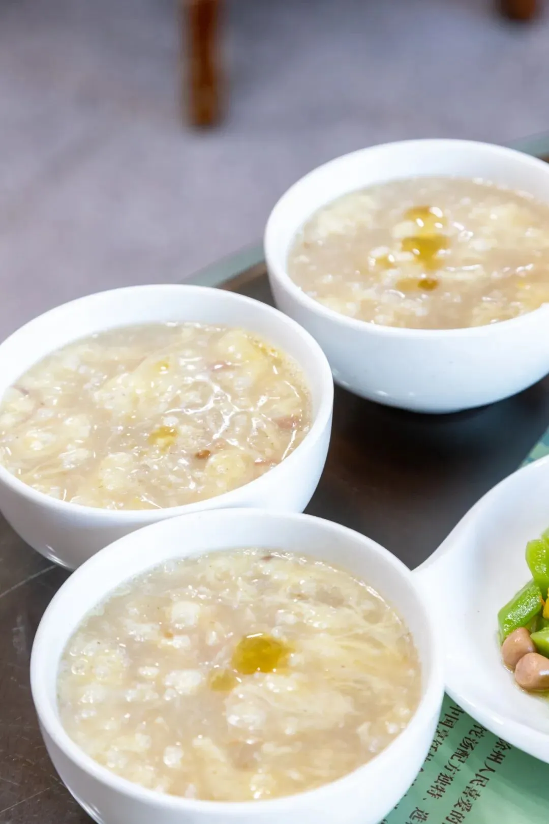 走进大门,原木色桌椅与墙上的老照片相映成趣,空气中弥漫着高汤的鲜香与手作点心的麦香,时光仿佛在此慢了下来。所谓“三珍”,指的就是馄饨、蒸饺、卤菜这三样招牌。