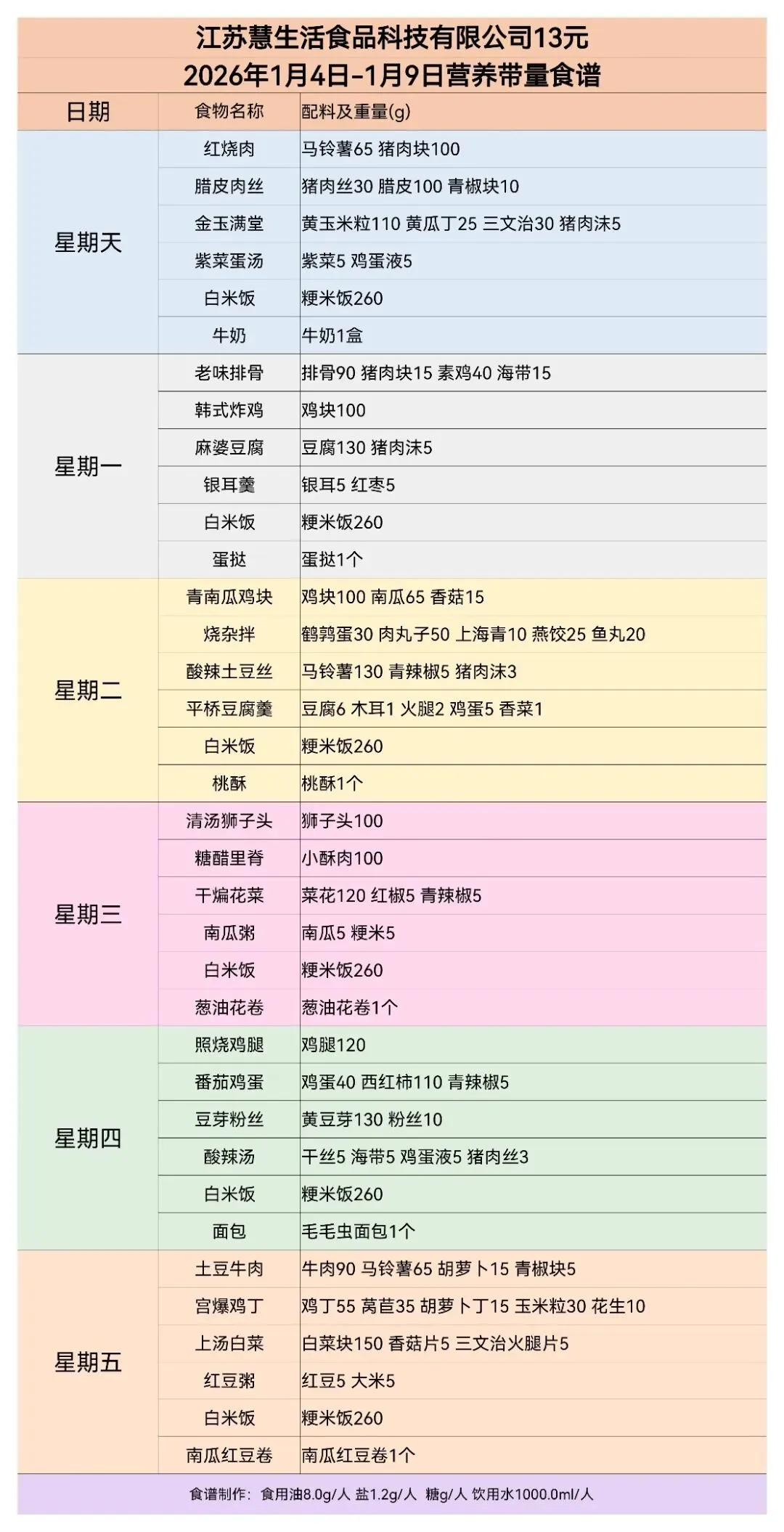 【徐州天勤餐饮有限公司】1月4日——1月9日菜谱公示