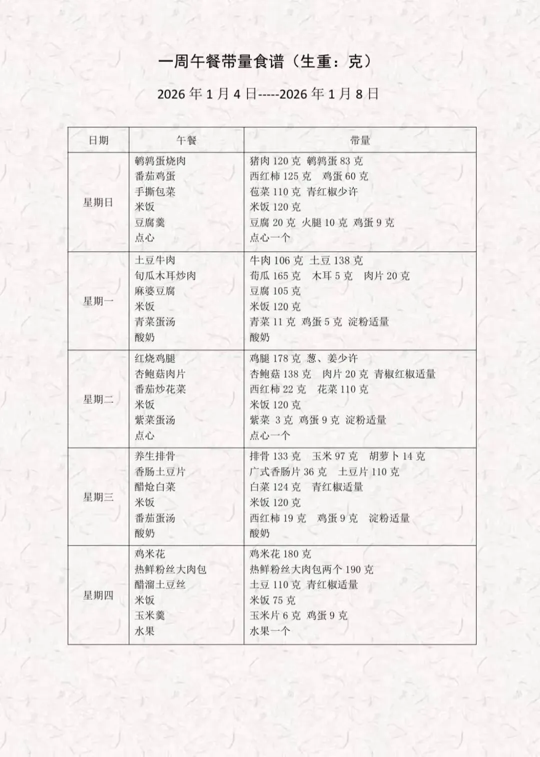 徐州市北辰小学带量食谱公示(2026.01.04~2026.01.09)