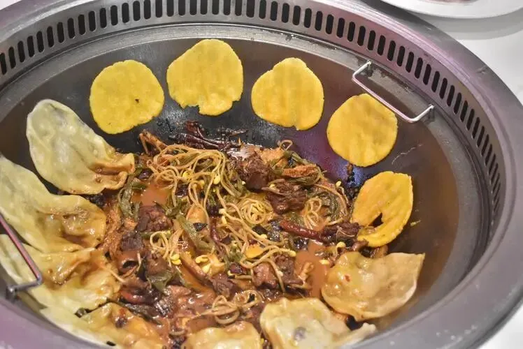 吃就奔地锅去,铁锅一架,柴火一旺,饼贴在边上,鸡在中间咕嘟咕嘟,很顶肚子。