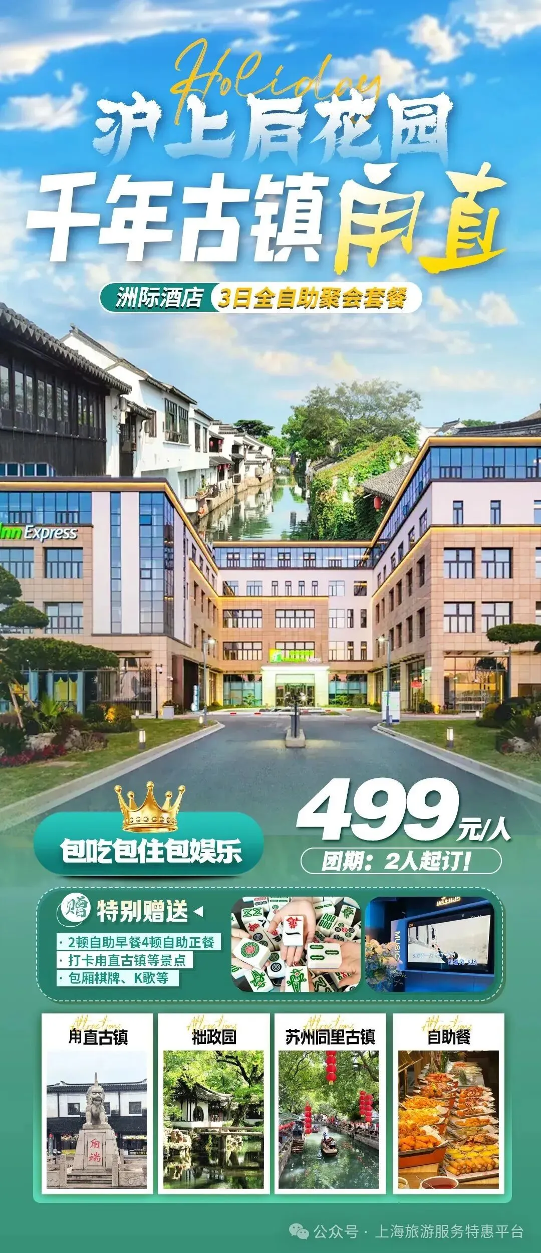 【苏州甪直智选假日酒店】烟雨江南姑苏城 洲际假日丨全程自助餐0差评!赠6餐含大巴接送仅499元,免费棋牌K歌!嗨玩打卡甪直古镇