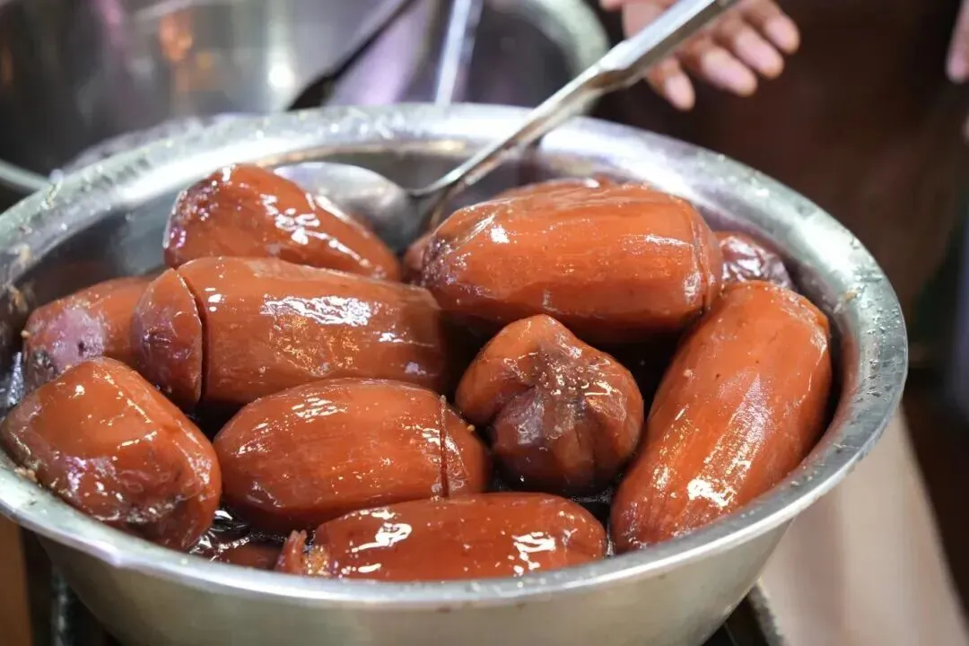 再加入桂花糖等调料,蒸煮而成