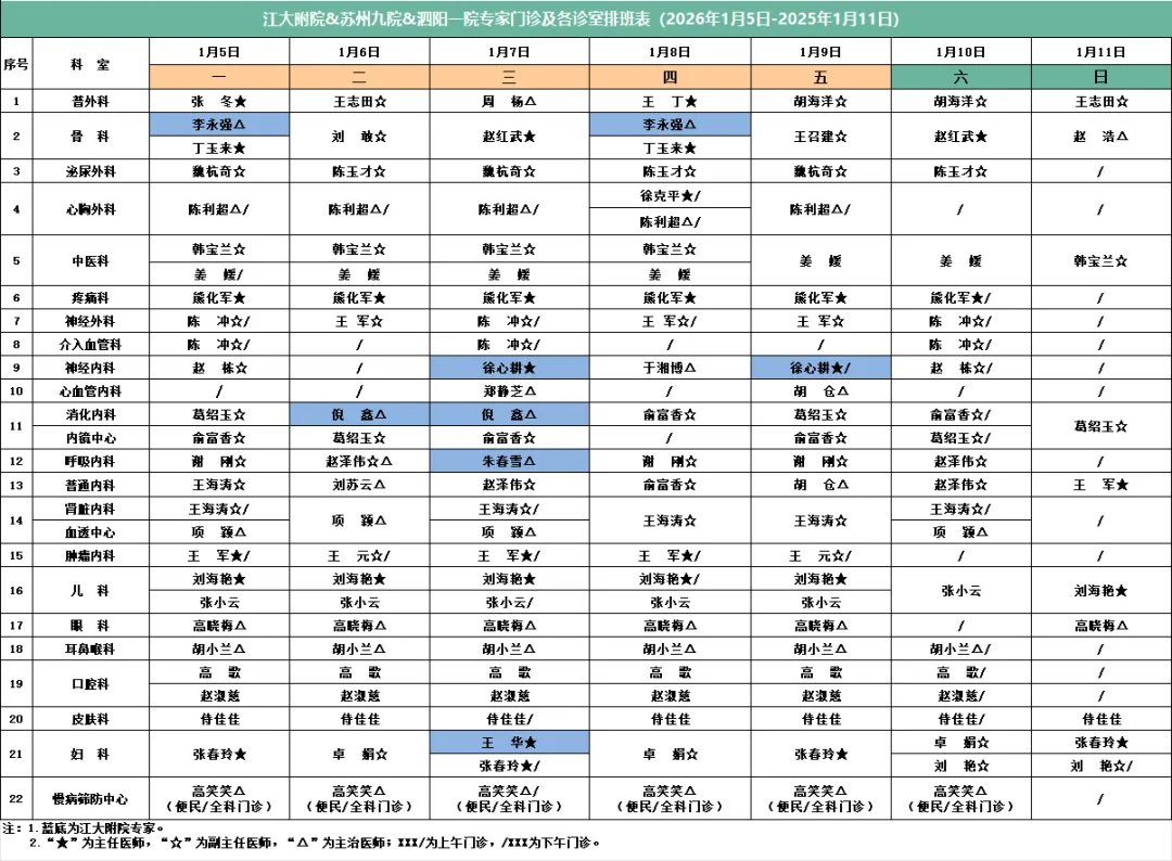 【医讯】江大附院&苏州九院&泗阳一院(1/5-1/11)门诊坐诊专家资讯!