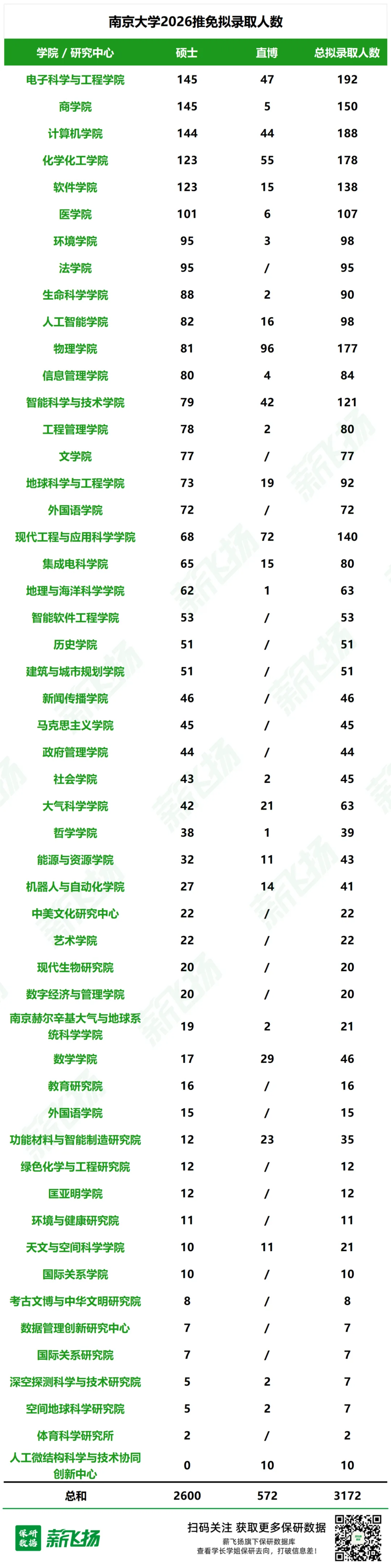 全校共拟录取 3172 人,其中硕士 2600 人(占比 81.97%),直博生 572 人(占比 18.03%),覆盖 51 个硕士招生院系