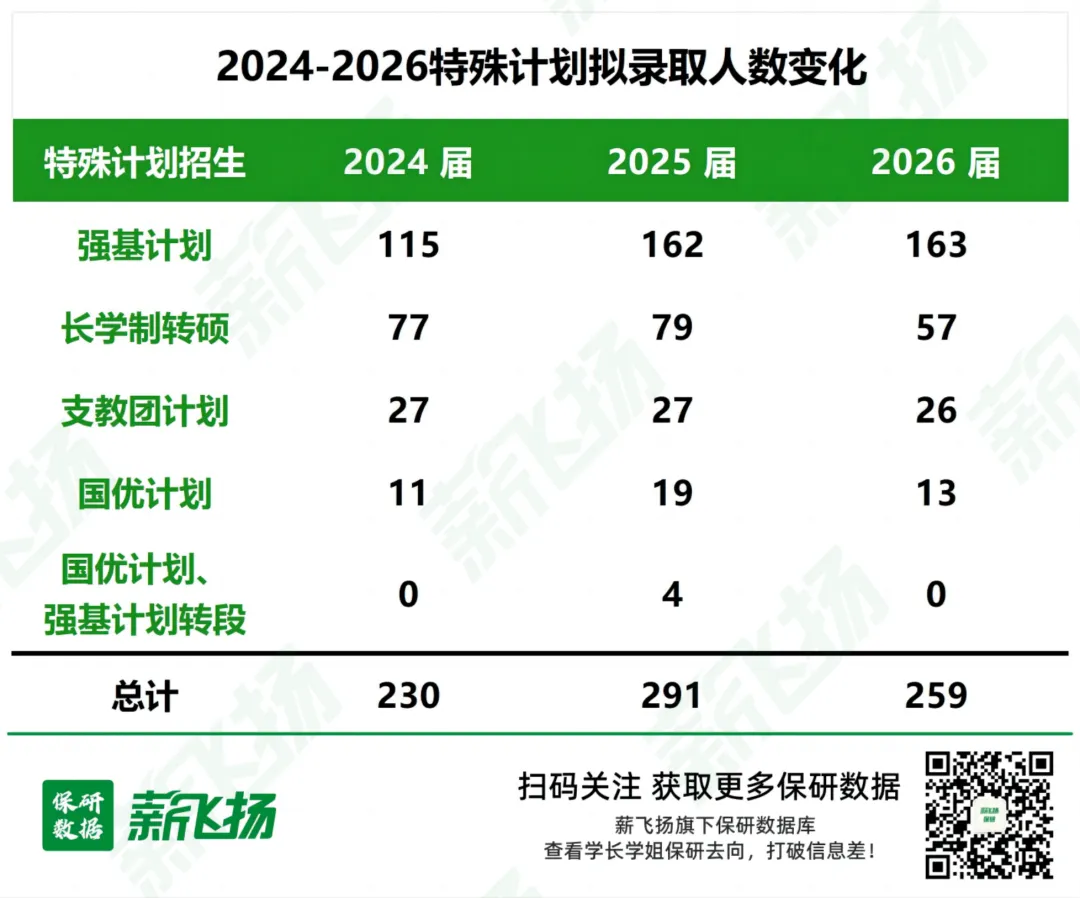 特殊计划同样占据重要地位:259 人通过专项计划入选(占总人数 8.2%),其中强基计划 163 人(占比最高)、长学制转硕 57 人、支教团计划 26 人、国优计划 13 人,成为基础学科优质生源的重要补充渠道。