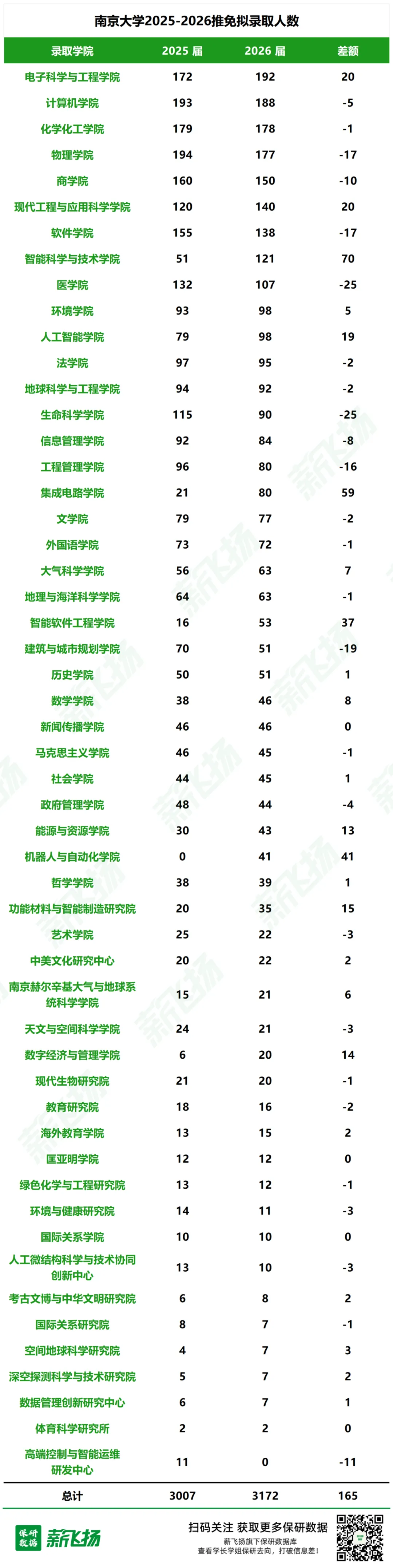 近两届推免数据显示,南大拟录取人数呈稳步上升趋势:2025 届 3007 人→2026 届3172 人,但各院系增减幅度差异明显,核心增长动力来自新工科与交叉学科。