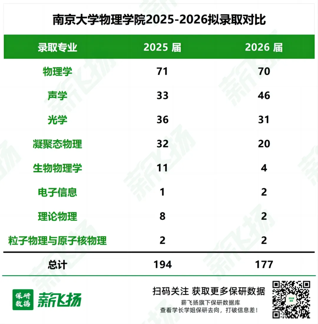 南大物理学院2026 届拟录取 177 人,其中直博 96 人、硕士 81 人,凸显 “科研导向”。专业上,物理学(70 名直博)、声学(46 人,硕士 20 人 + 直博 26 人)是主力,光学(31 人)、凝聚态物理(20 人)等仅招硕士。